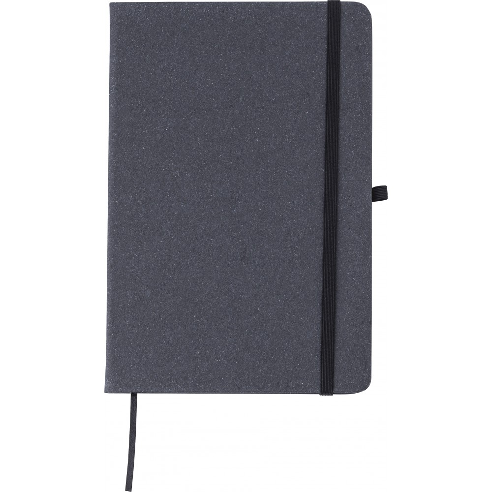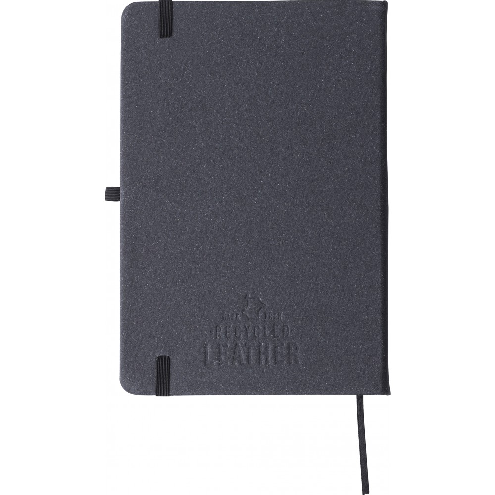 Újrahasznosított bőrből készült A5-ös jegyzetfüzet 100 vonalas lappal. Gumis záródás, tollhurok és könyvjelző szalag. Hátoldalán az újrahasznosított anyagra utaló logónyomat látható. Emblémázás: Tamponnyomás, UV nyomtatás