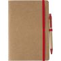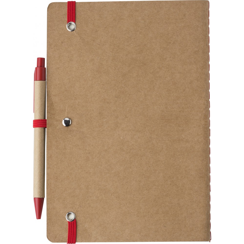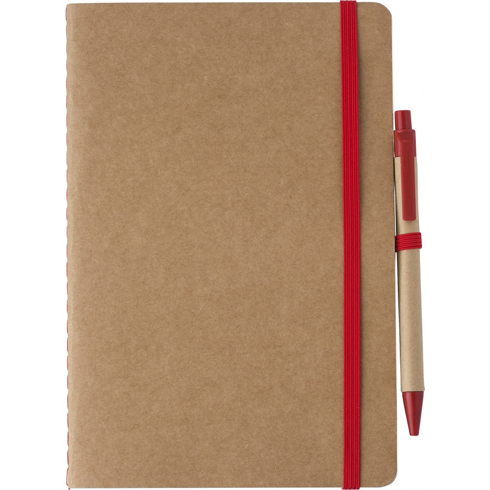 Újrahasznosított karton jegyzetfüzet 60 sima lappal. Tartalmazza a hozzáillő karton/szalma tollat kék tollbetéttel. Gumis összefogó pánt és tollhurok. Emblémázás: Szitanyomás, Tamponnyomás, UV nyomtatás