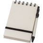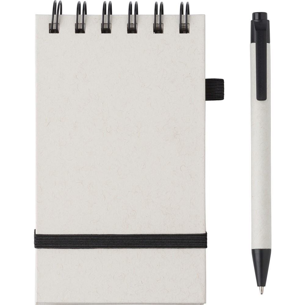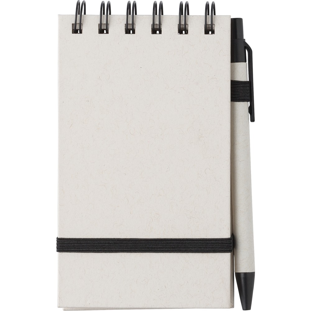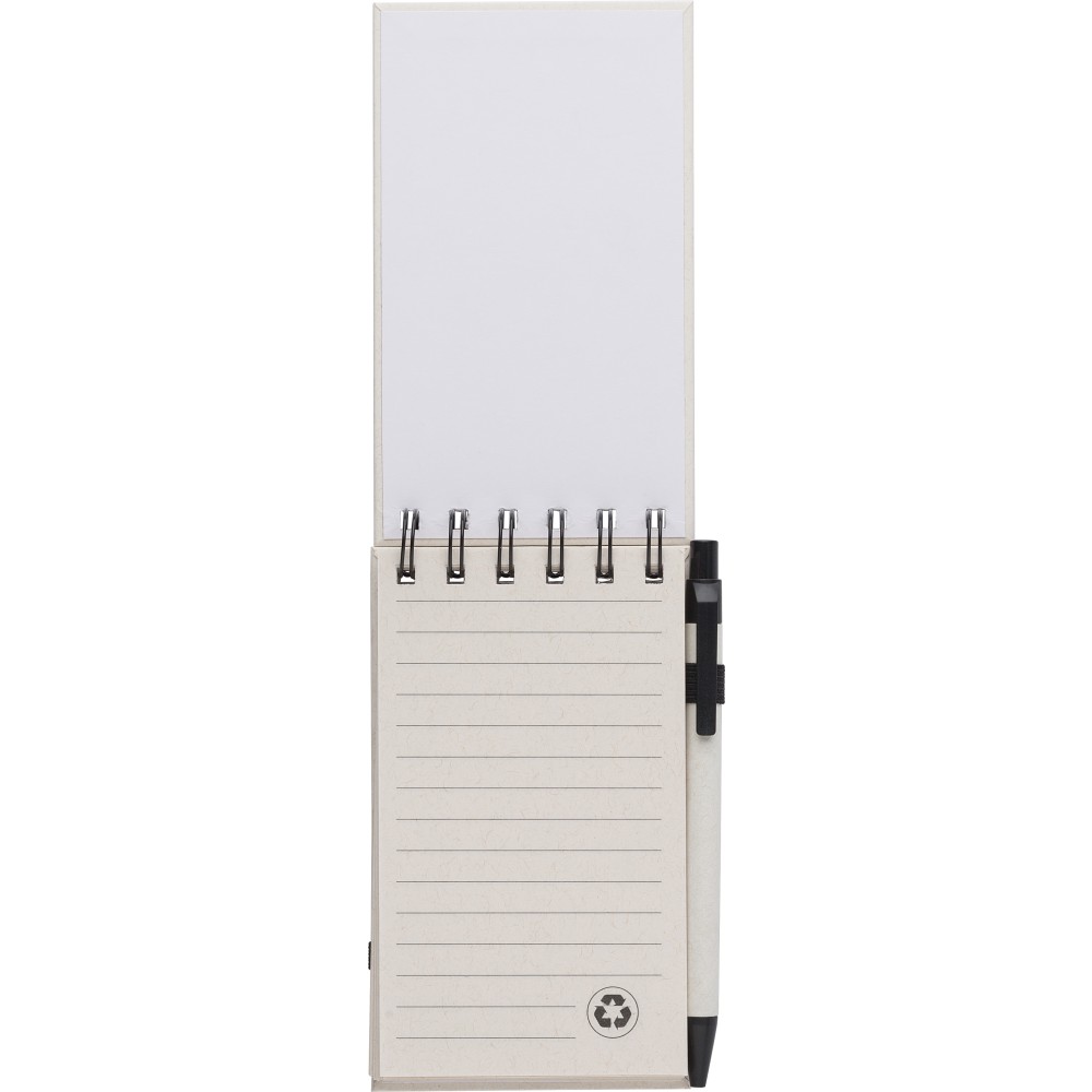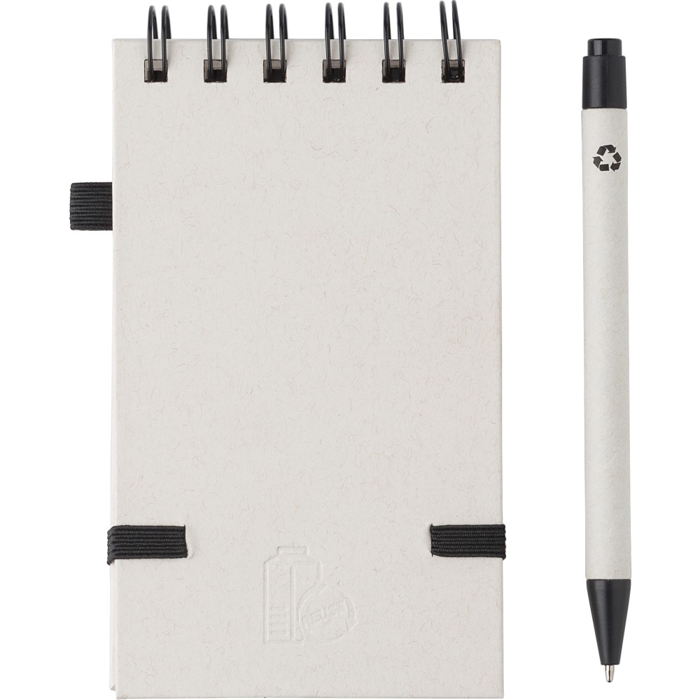 Újrahasznosított tejesdobozból készült A6-os jegyzetfüzet, 70 lappal, gumiszalaggal és tollhurokkal. A toll kék tollbetéttel érkezik. 70%-ban újrahasznosított tejeskartonból és 30%-ban újrahasznosított (sima) papírból készült. Emblémázás: Tamponnyomás