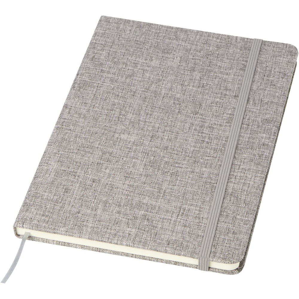 Kemény fedeles A5 jegyzetfüzet újrahasznosított pamutból, 80 soros 70 g/m2 papírral. A jegyzetfüzet gumis záródással, szalaggal és lekerekített sarkokkal rendelkezik. Emblémázás: Szitanyomás