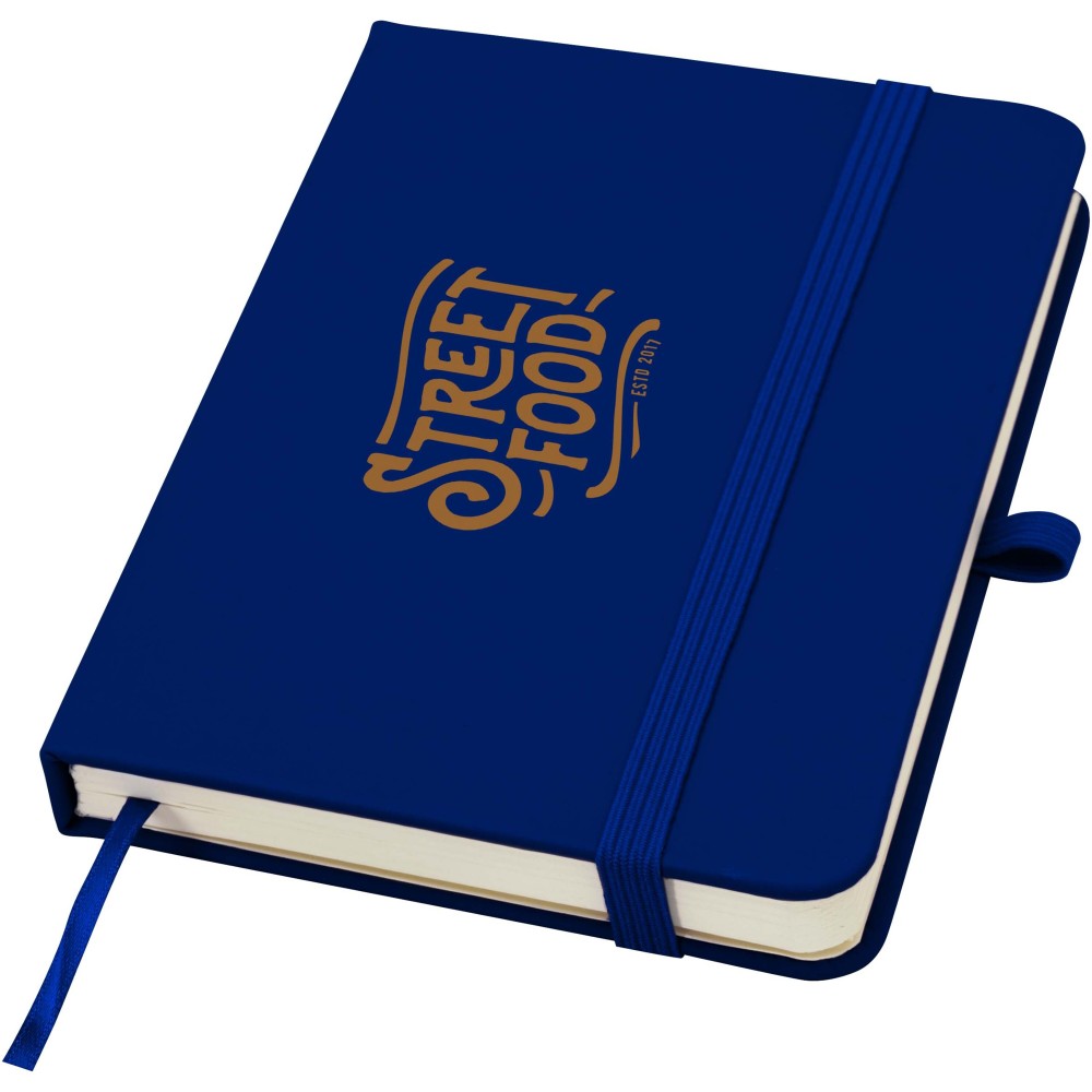 A Spectrum Plus A6 keményfedeles jegyzetfüzet lekerekített sarkokkal nemcsak az irodai mindennapok elengedhetetlen kelléke, hanem remek lehetőség márkád népszerűsítésére is. A jegyzetfüzet puha tapintású borítóval rendelkezik és 80 vonalas, krémszínű, 70 g/m2-es lapból áll, amely tökéletes gyors ötletek vagy hosszabb jegyzetek rögzítésére. A jegyzetfüzet tolltartó hurokkal, gumiszalagos záródással, könyvjelzővel és harmonikazsebbel van ellátva. Emblémázás: Tamponnyomás