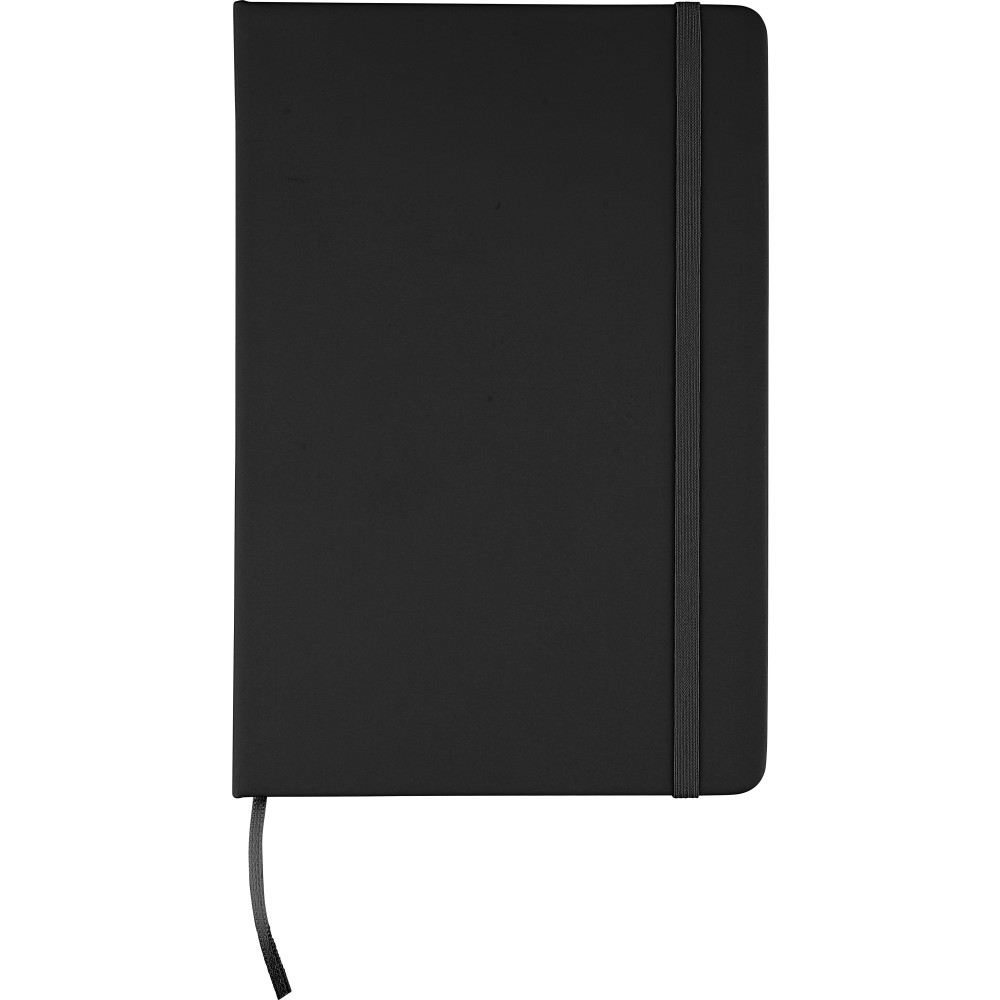 A5-ös méretű jegyzetfüzet rPET PU anyagból készült kemény borítóval, 80 vonalas lappal (70g/m2), színben illeszkedő gumipánttal és könyvjelző szalaggal. Az újrahasznosított anyagra utaló dombornyomott logóval a füzet hátoldalán. Emblémázás: Szitanyomás, Tamponnyomás, UV nyomtatás