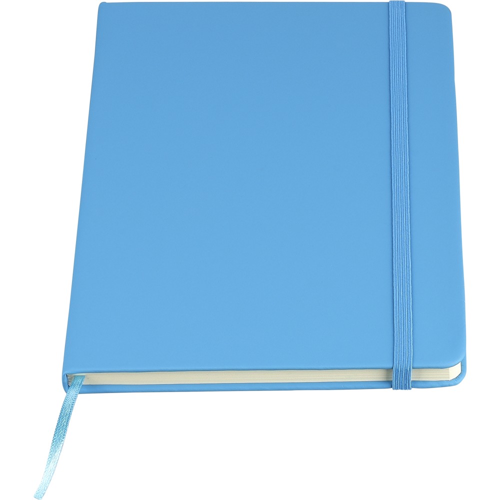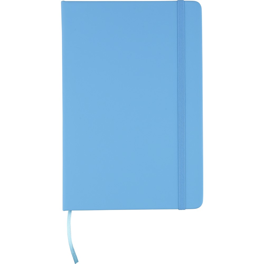 A5-ös méretű jegyzetfüzet rPET PU anyagból készült kemény borítóval, 80 vonalas lappal (70g/m2), színben illeszkedő gumipánttal és könyvjelző szalaggal. Az újrahasznosított anyagra utaló dombornyomott logóval a füzet hátoldalán. Emblémázás: Szitanyomás, Tamponnyomás, UV nyomtatás