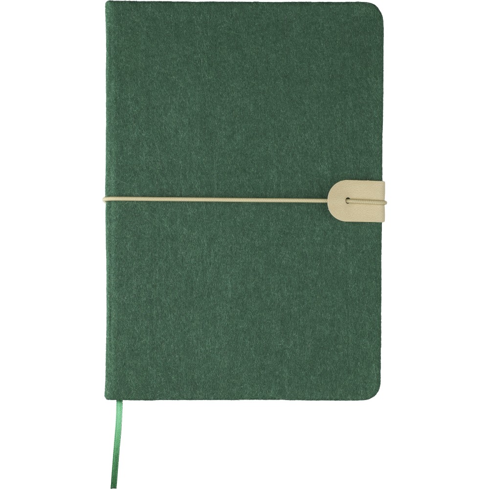 Újrahasznosított filcből készült jegyzetfüzet, kb. A5-ös méretű, 80 lapos. Puha tapintású kemény borítóval, gumiszalaggal és kívül PU zárópánttal. Szalagos könyvjelzővel és 70 g/m2-es vonalas papírral. A hátoldalán lézergravírozott újrahasznosított logóval. Emblémázás: Szitanyomás