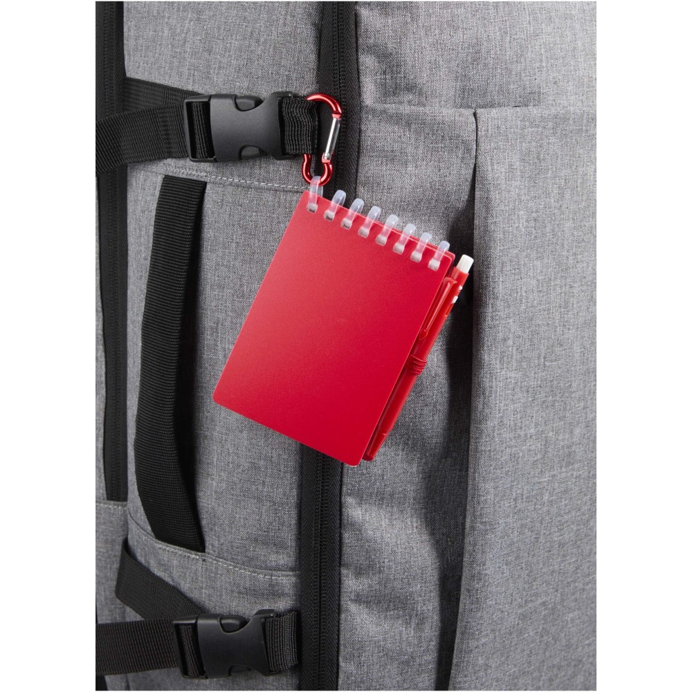 A Lig Mini jegyzetfüzet és toll szett kompakt és praktikus társ a gyors jegyzeteléshez útközben. A spirálfüzet puha, újrahasznosított műanyag borítással és 70 darab, 120 g/m2 súlyú, vízálló kőpapírból készült üres lappal rendelkezik, így ideális választás szabadtéri használatra is. A kerekített sarkokkal és beépített tolltartó pánttal ellátott kiegészítő tökéletesen követi a "mini" trendet, miközben teljesen funkcionális marad. A szetthez tartozó golyóstoll újrahasznosított ABS műanyagból készült, fekete tintával ír, íráshossza pedig 250 méter. A színben harmonizáló fémgyűrű segítségével a szett könnyen rögzíthető hátizsákra, táskára vagy kulcscsomóra, így tartós és hordozható megoldást nyújt a jegyzetek rögzítéséhez. A jegyzetfüzet mérete: 11 × 7,5 cm. Emblémázás: Szitanyomás, Tamponnyomás