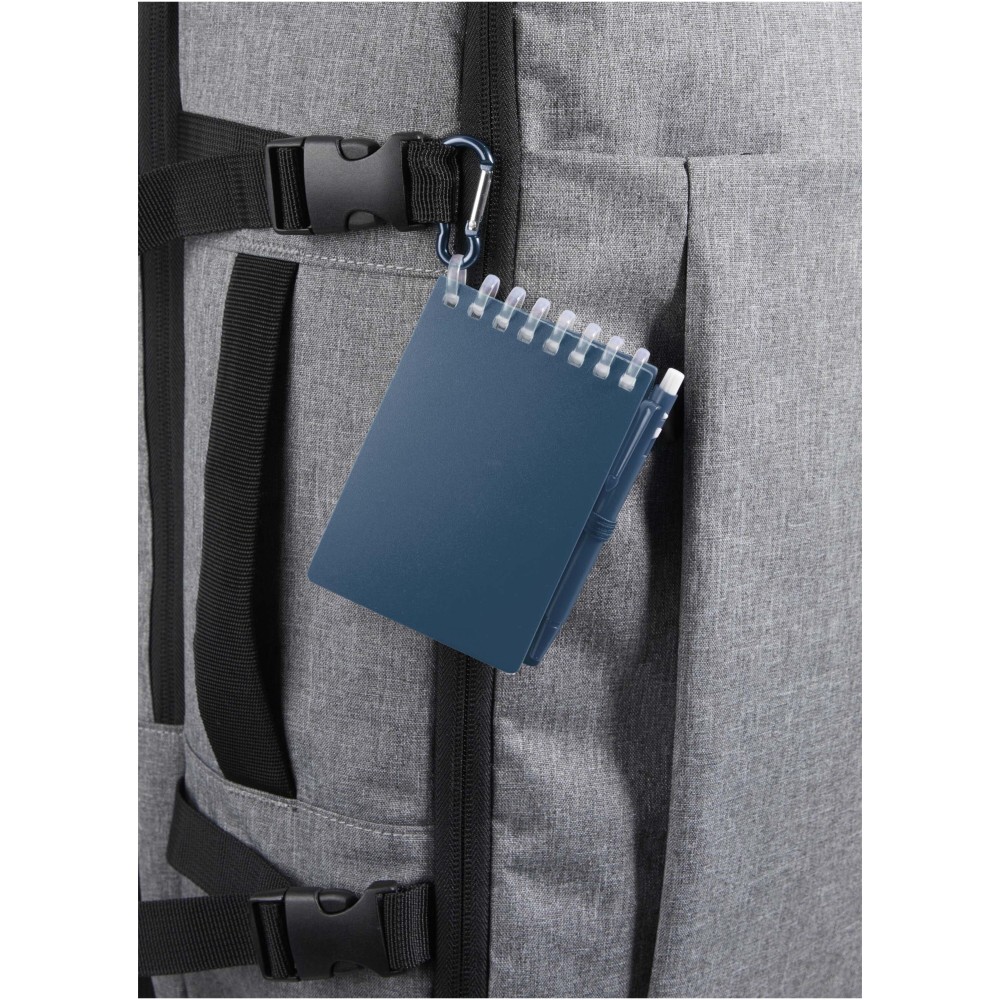 A Lig Mini jegyzetfüzet és toll szett kompakt és praktikus társ a gyors jegyzeteléshez útközben. A spirálfüzet puha, újrahasznosított műanyag borítással és 70 darab, 120 g/m2 súlyú, vízálló kőpapírból készült üres lappal rendelkezik, így ideális választás szabadtéri használatra is. A kerekített sarkokkal és beépített tolltartó pánttal ellátott kiegészítő tökéletesen követi a "mini" trendet, miközben teljesen funkcionális marad. A szetthez tartozó golyóstoll újrahasznosított ABS műanyagból készült, fekete tintával ír, íráshossza pedig 250 méter. A színben harmonizáló fémgyűrű segítségével a szett könnyen rögzíthető hátizsákra, táskára vagy kulcscsomóra, így tartós és hordozható megoldást nyújt a jegyzetek rögzítéséhez. A jegyzetfüzet mérete: 11 × 7,5 cm. Emblémázás: Szitanyomás, Tamponnyomás