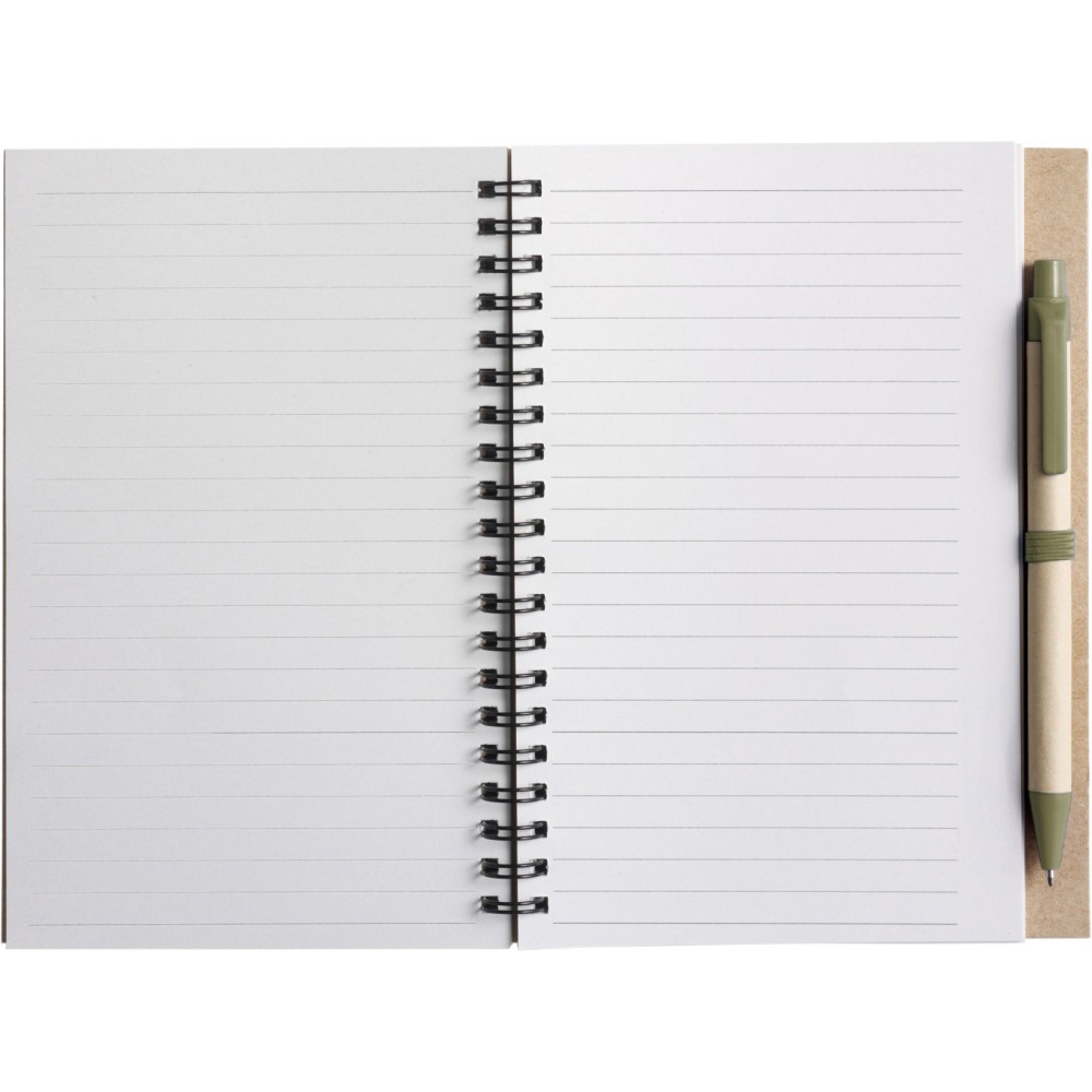 Újrahasznosított papírból készült spirálfüzet 60 vonalas lappal és golyóstoll biológiailag lebomló részekkel, kék tollbetéttel. Emblémázás: Szitanyomás, Tamponnyomás