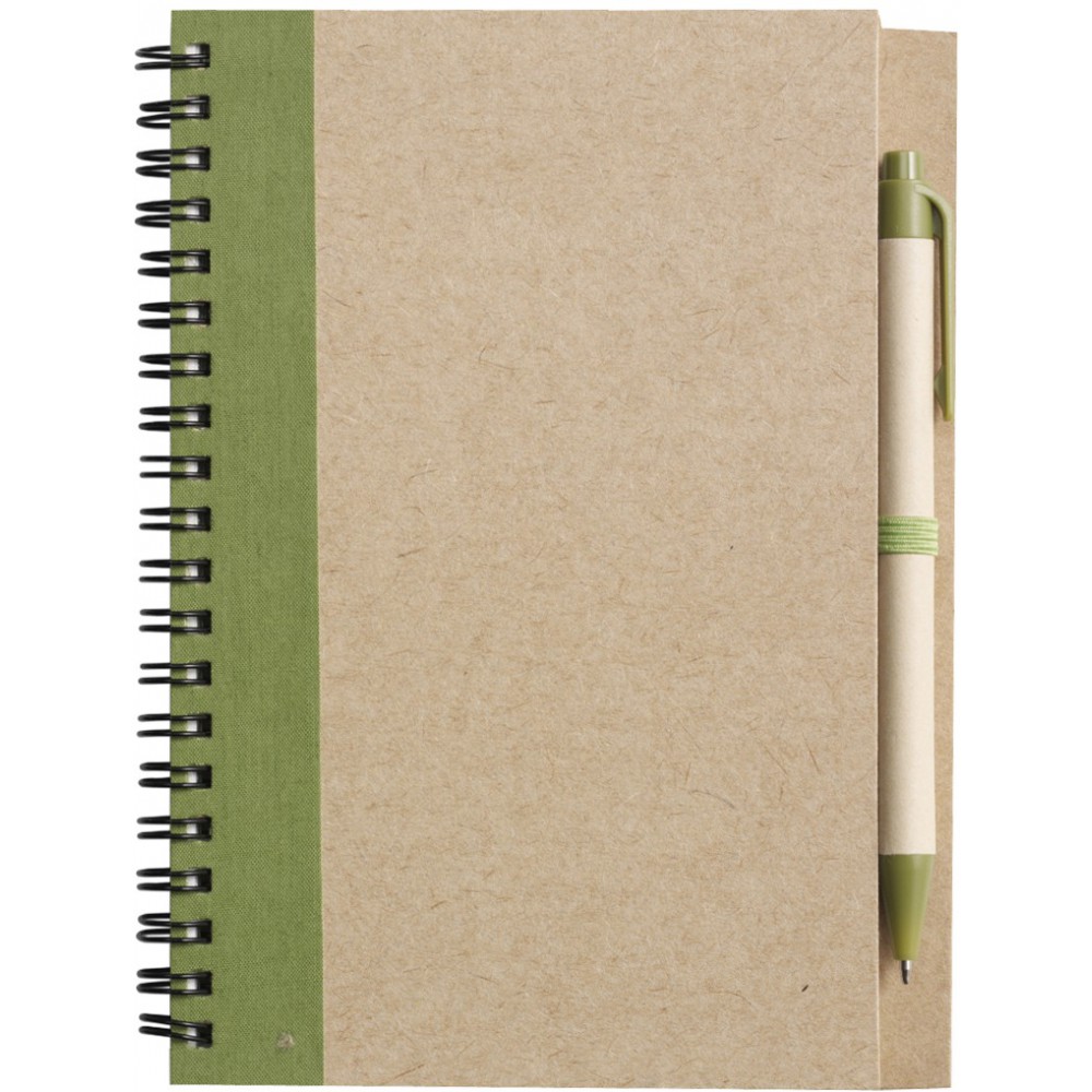 Újrahasznosított spirálfüzet tollal, 60 lapos, zöld/natúr