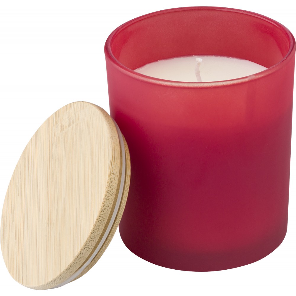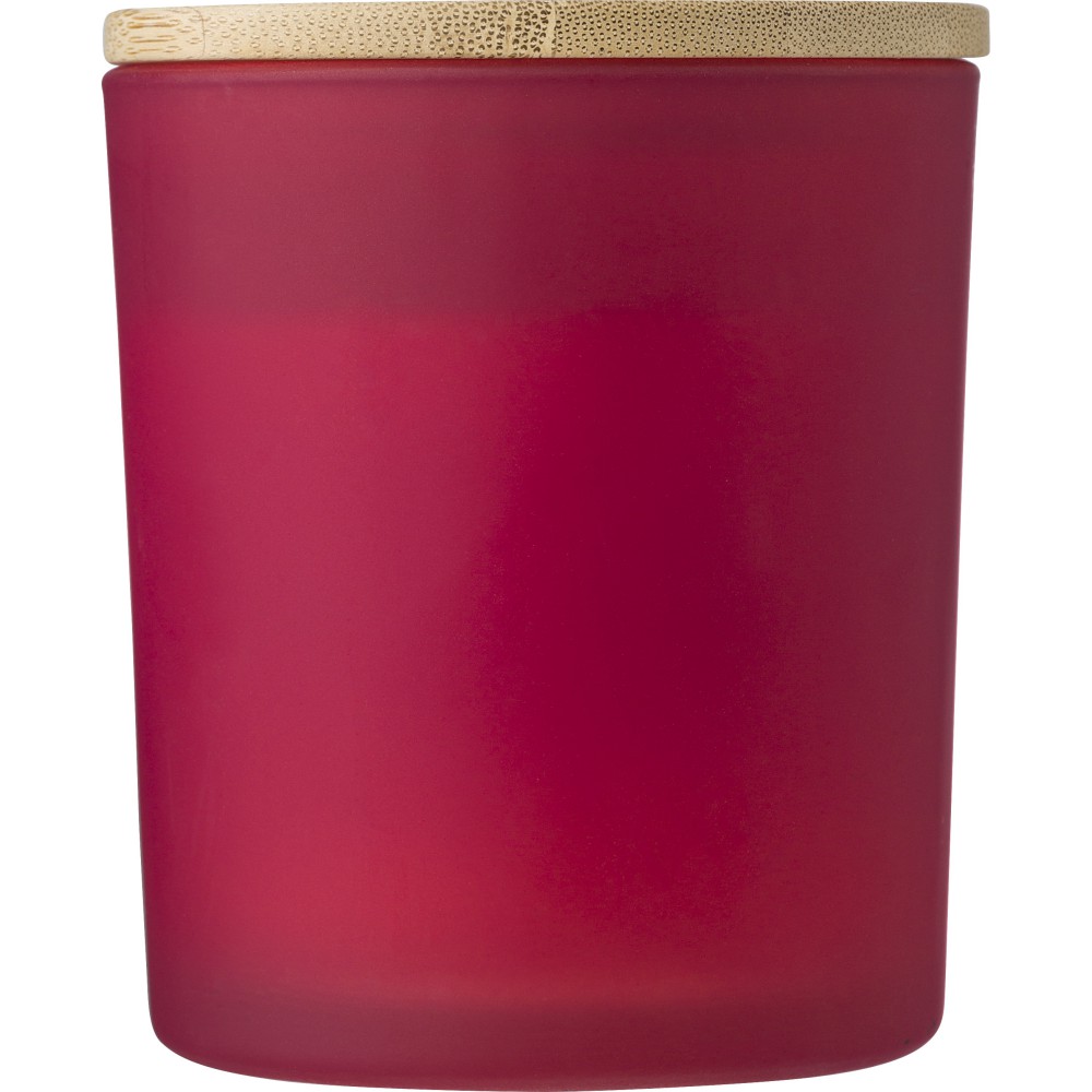 Üveggyertya növényi alapú viasszal és bambusz fedővel. A gyertya főleg növényi alapú viaszt (karnaubaviaszt) tartalmaz, égési ideje körülbelül 46 óra. Négy illat az üveg színétől függően: fahéj (piros), vanília (fehér), szantálfa (fekete) és jázmin (zöld). Egyenként, fehér papírpalástba csomagolva. Emblémázás: Gravírozás, UV nyomtatás