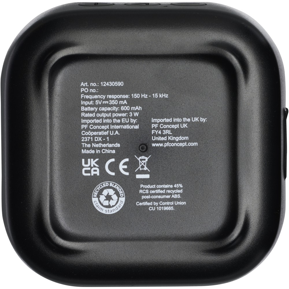 RCS újrahasznosított 3W-os Bluetooth hangszóró, amely zenét, podcastokat, stb. játszik le bármely Bluetooth kompatibilis eszközéről, így ideális társ minden alkalomhoz. A hangszóró beépített vezérlőkkel és mikrofonnal rendelkezik. Élvezze zenéit akár 3-4 órán keresztül maximális hangerőn. A töltési idő 3 óra. Bluetooth 5.3 körülbelül 10 méteres működési hatótávolsággal. Használati útmutatóval, 30 cm-es USB-A-C típusú töltőkábellel és fenntartható forrásból származó, 100%-ban újrahasznosított kartondobozba csomagolva szállítjuk. Újrahasznosított ABS műanyag. Csomagolás: FSC Recycled 100% P5.1 CU-COC-877277. Emblémázás: UV nyomtatás