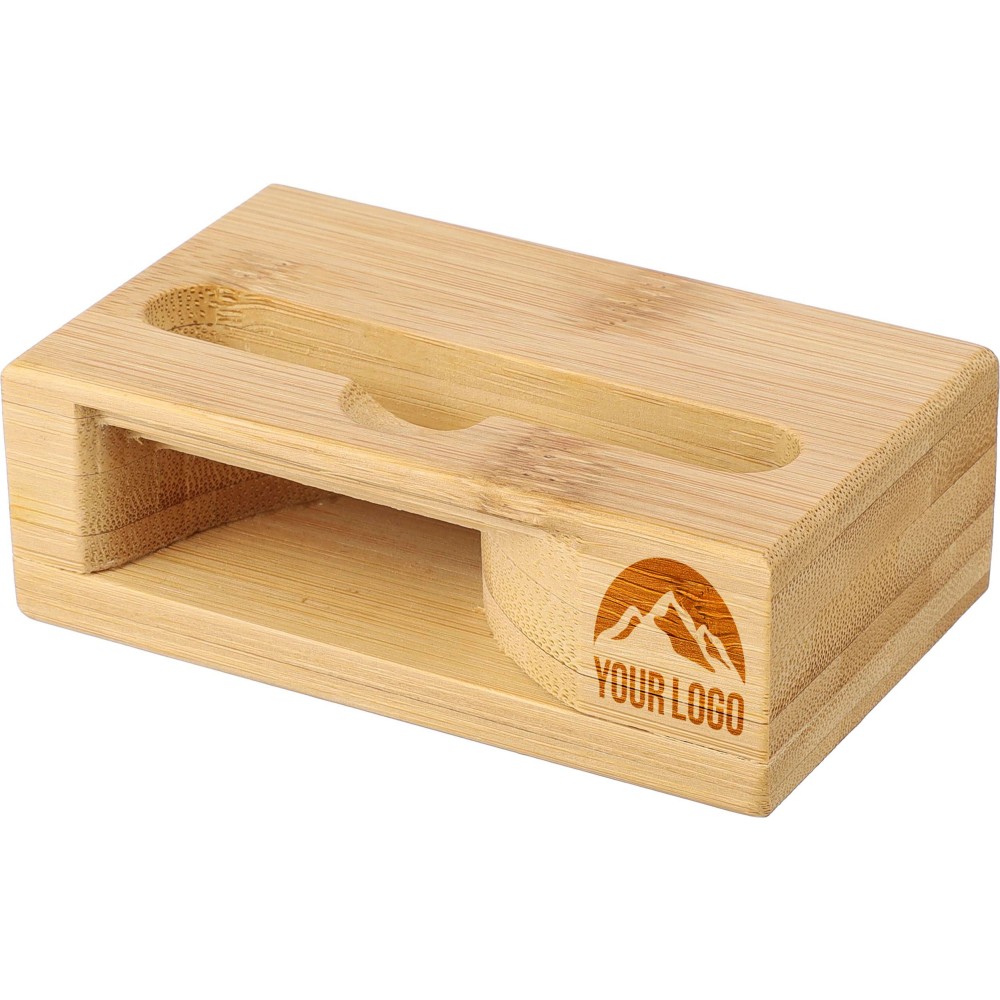 Bambusz telefontartó hangszóró funkcióval. Zenelejátszás közben az alsó részen keresztül erősíti a hangot áram vagy elem használata nélkül. Telefontartó nyílás méretei: kb. 8,2 x 1,2 cm. Egyenként barna kartondobozba csomagolva. Emblémázás: Gravírozás, Tamponnyomás