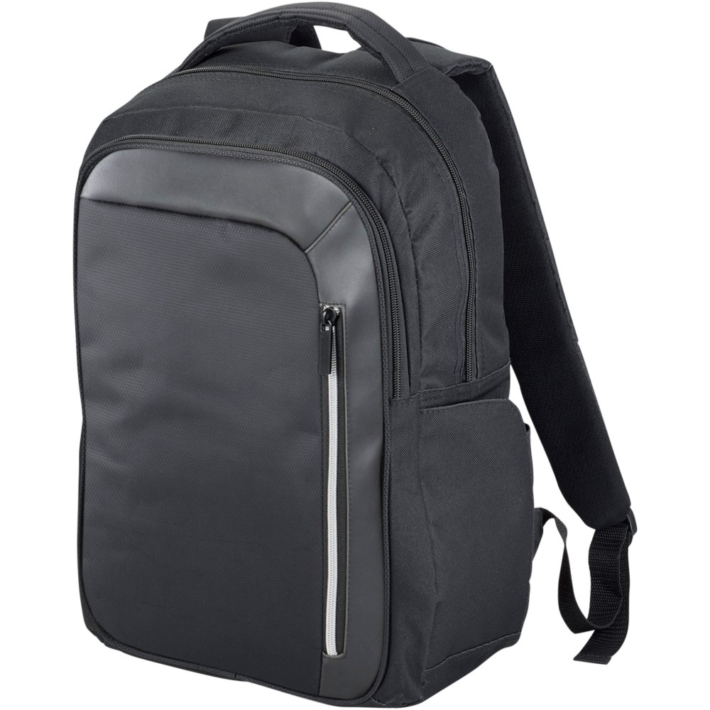 Elegáns, trendi, 15,6 -es laptop hátizsák nagy cipzáras, kulcstartós első zsebbel és rejtett RFID technológiájú blokkoló zsebbel a kártyák és okmányok adatlopás elleni védelme érdekében. A nagy, cipzáras fő tárolórész 15,6 -es laptop tárolására alkalmas, és elkölönített, párnázott résszel rendelkezik iPad vagy tablet számára. Az első, függőleges cipzár nyújt hozzáférést az első zsebhez. Két kiegészítő oldalzseb további tárolási lehetőséget biztosít, a párnázott, állítható vállpántok kényelmes viseletet nyújtanak, a hordozófül és a gurulós bőröndre húzható zseb lehetővé teszi a könnyű hordozást. Emblémázás: Szitanyomás