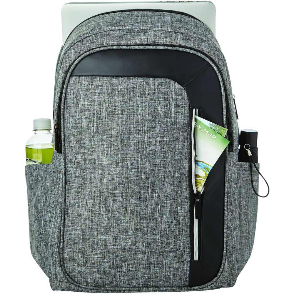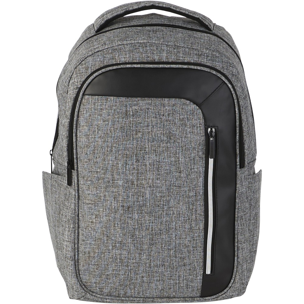 Elegáns, trendi, 15,6 -es laptop hátizsák nagy cipzáras, kulcstartós első zsebbel és rejtett RFID technológiájú blokkoló zsebbel a kártyák és okmányok adatlopás elleni védelme érdekében. A nagy, cipzáras fő tárolórész 15,6 -es laptop tárolására alkalmas, és elkölönített, párnázott résszel rendelkezik iPad vagy tablet számára. Az első, függőleges cipzár nyújt hozzáférést az első zsebhez. Két kiegészítő oldalzseb további tárolási lehetőséget biztosít, a párnázott, állítható vállpántok kényelmes viseletet nyújtanak, a hordozófül és a gurulós bőröndre húzható zseb lehetővé teszi a könnyű hordozást. Emblémázás: Szitanyomás