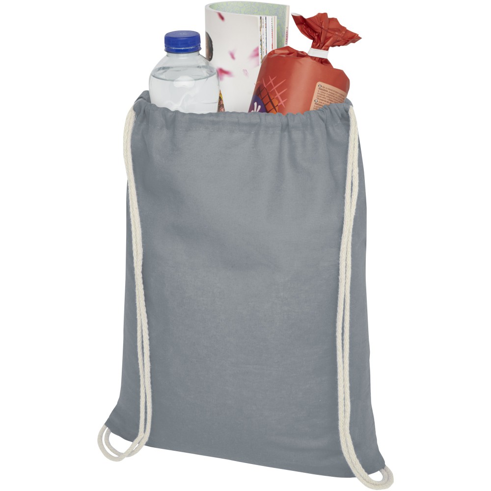 Húzózsinórral zárható nyitott fő rekesz. 100 g/m2 pamut. Emblémázás: Szitanyomás