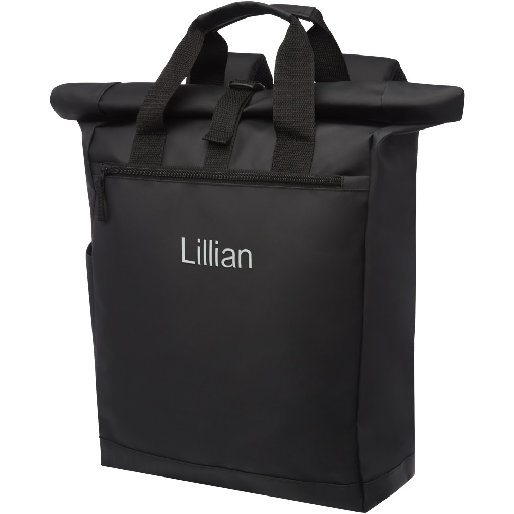 Vízálló hátizsák párnázott laptoptartóval, párnázott állítható vállpántokkal, cipzáras fő rekesszel, feltekerhető zárással és 2 füllel. Vitorlavászon. Emblémázás: Hímzés, Szitanyomás