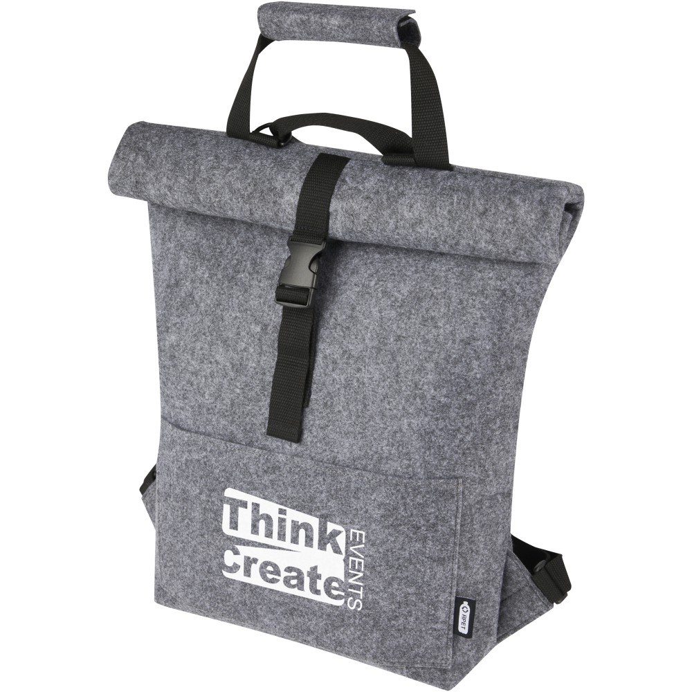 Többfunkciós és trendi kombinált roll-top hátizsák és kerékpártáska kiváló minőségű, puha és tartós GRS tanúsítvánnyal rendelkező újrahasznosított filcből. Nagy fő rekesszel, elülső zsebbel, állítható vállpántokkal és 3 akasztós pánttal, amellyel a táskát a kerékpár hátuljához rögzítheti. A vállpántok könnyen átalakíthatók hosszú füllé, vagy behajthatóak, így a hevederek nem akadnak be a kerékpár kerekébe. Emblémázás: Hímzés, Szitanyomás
