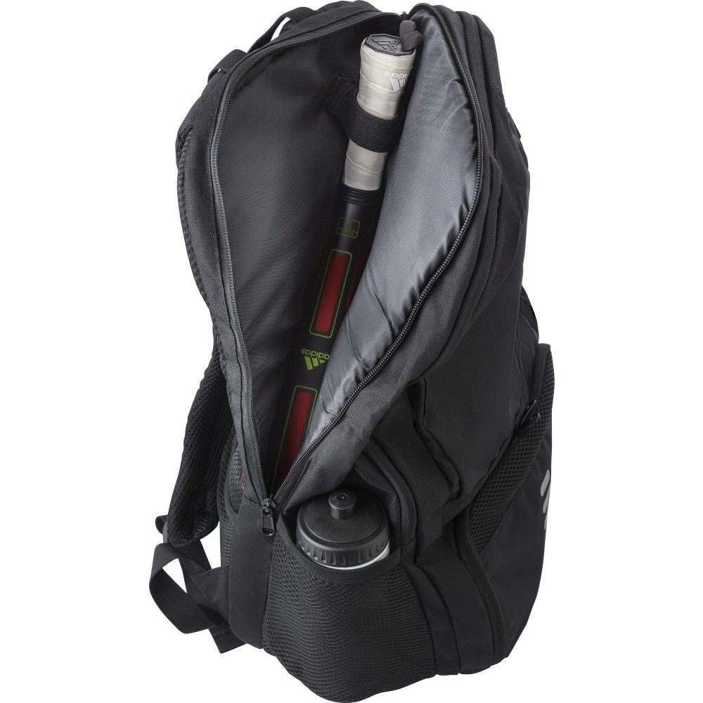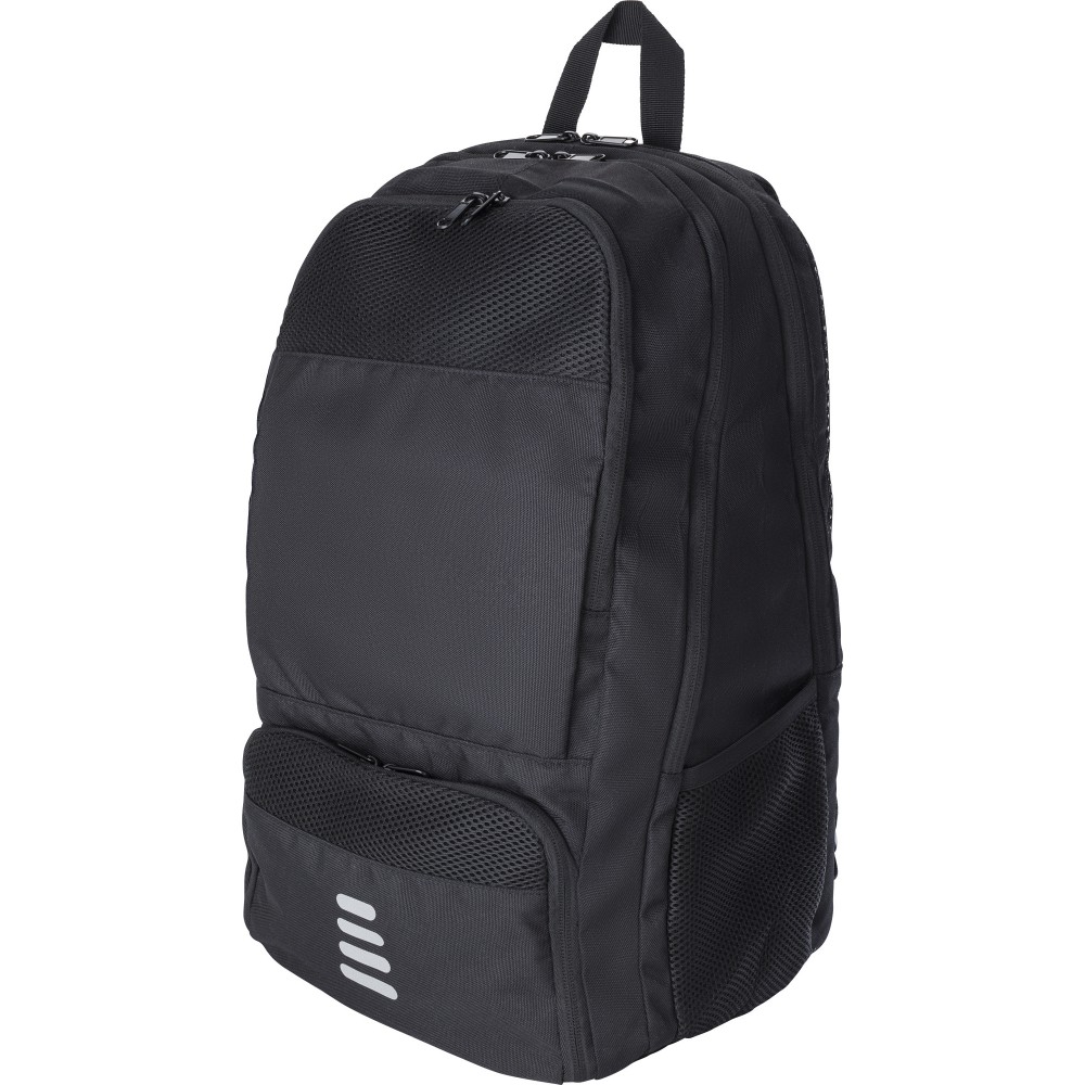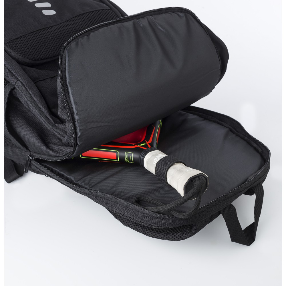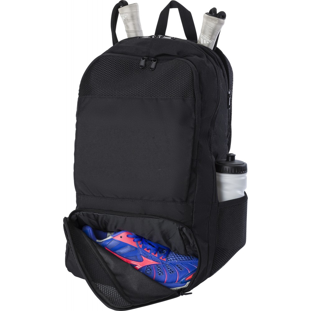 RPET poliészter többfunkciós hátizsák. 210D bélés és RPET 600D külső. Funkciók: ütőtartó zseb, lopásgátló zseb, cipőzseb, laptop zseb, palacktartók. A táska párnázott, állítható pántokkal rendelkezik, és vízlepergető bevonattal van ellátva. Emblémázás: Szitanyomás