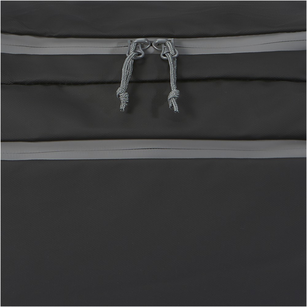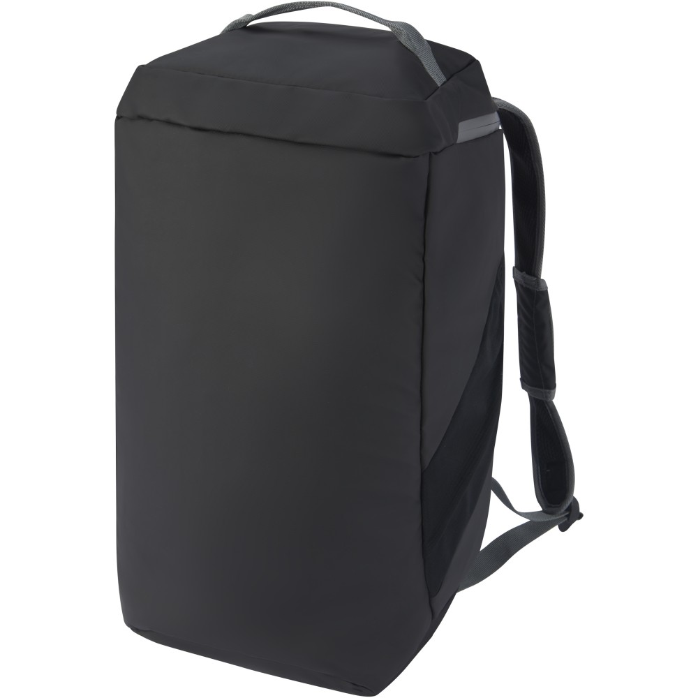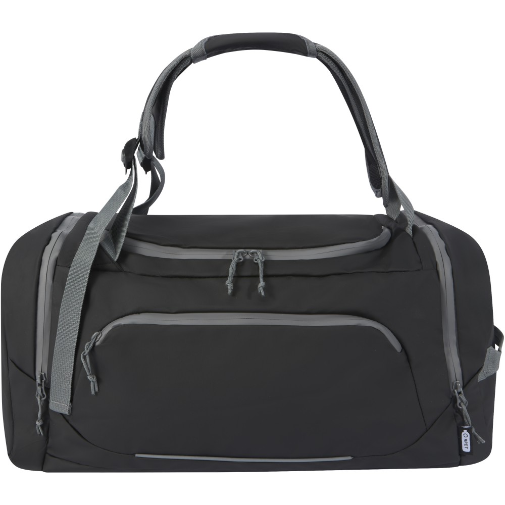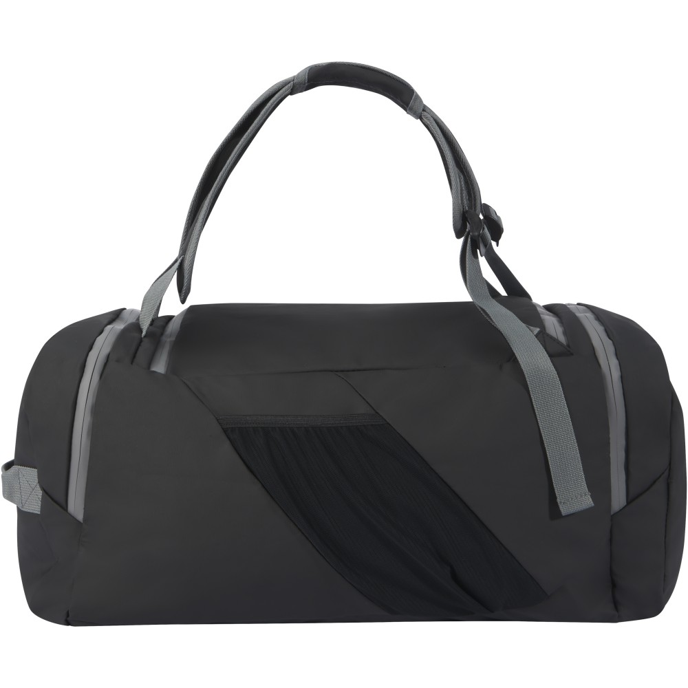 Vízálló 2 az 1-ben sporttáska és hátizsák GRS tanúsítvánnyal rendelkező újrahasznosított anyagokból, beleértve a cipzárakat is. Tágas főrekesszel rendelkezik, U alakú nyílással a könnyű tárolás és hozzáférés érdekében, két cipzáras oldalzsebbel (köztük egy cipőrekesszel), egy cipzáras elülső zsebbel, egy hálós vízzsebbel a hátoldalon, valamint fényvisszaverő csíkokkal a láthatóság érdekében. Ez a táska 3 különböző módon hordható: kézben, vállon átvetve vagy hátizsákként a párnázott és állítható vállpántok segítségével. A GRS újrahasznosított anyagai közé tartozik a főszövet, a bélés, a hevederek és a cipzárak. Űrtartalom: 35 liter. PVC-mentes. Emblémázás: Szitanyomás