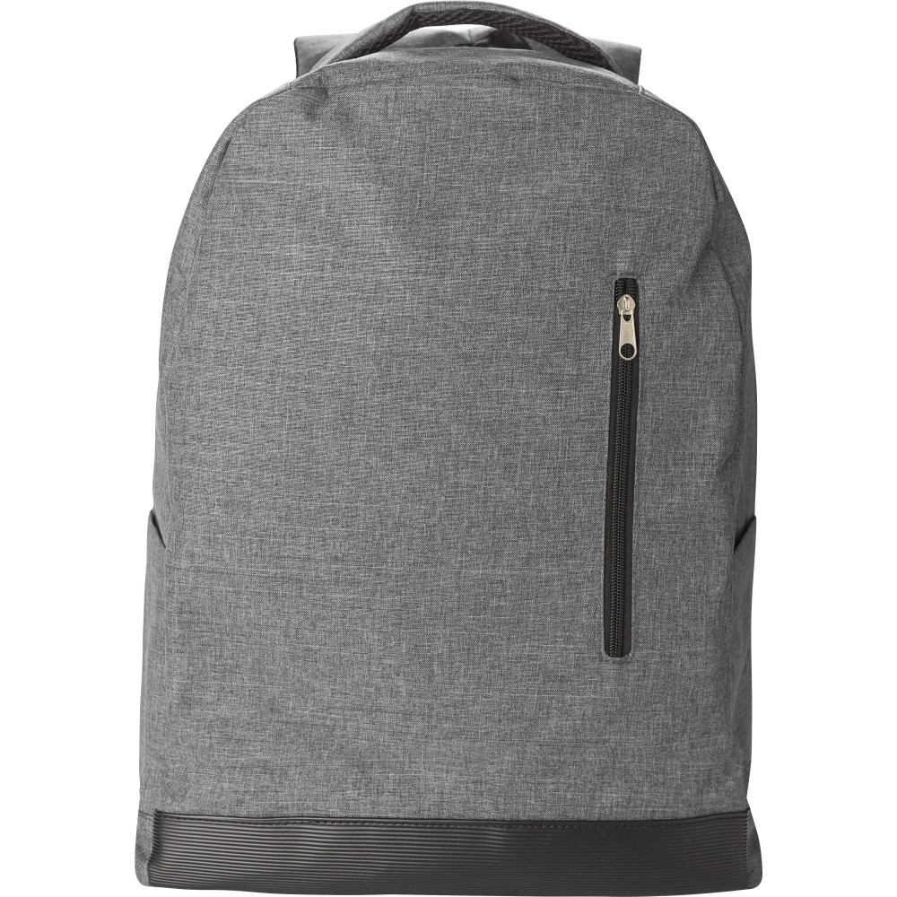 600D RPET poliészter lopásgátló hátizsák hátul gurulós bőröndre húzható pánttal. Elöl egy kis cipzáros zseb. Mindkét oldalán palacktartó zseb. Belül egy nagy rekesz tépőzáras laptop zsebbel. Alkalmas nagyméretű laptopokhoz. Állítható vállpántok. Alul egy kis bélelt rész újrahasznosított autógumiból. Emblémázás: Szitanyomás