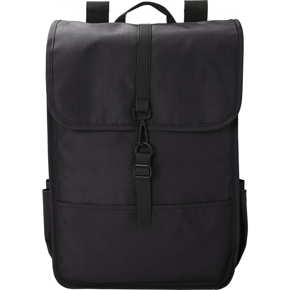 Hátizsák. Két palackzseb az oldalán, egy nagy rekesz. Fekete PU pánttal, csattal zárható. 300D RPET poliészter. Emblémázás: Szitanyomás