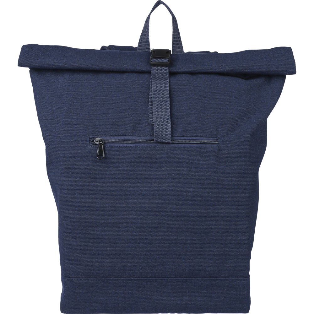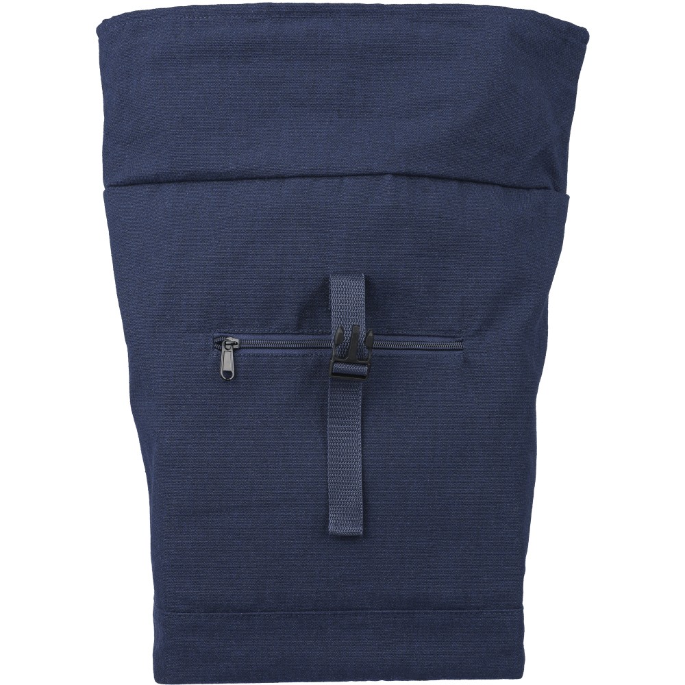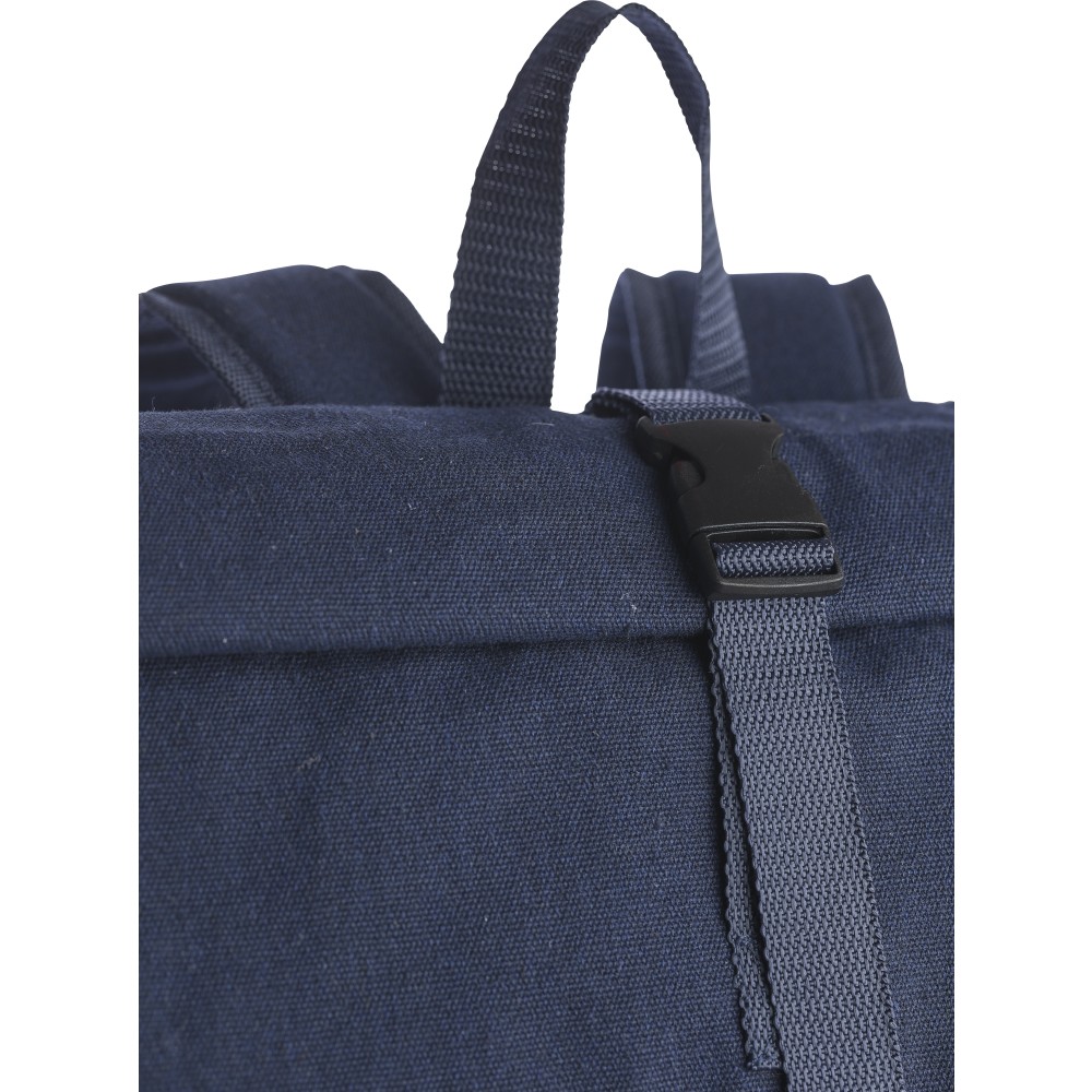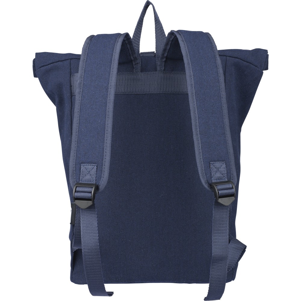 Rolltop hátizsák 330 g/m2 újahasznosított policotton anyagból, 210D poliészter béléssel és műanyag csattal. 15 literes űrtartalommal, egy nagy cipzáras rekesszel, 15"-es laptoptartó résszel, két belső és egy külső rekesszel. Tetején hordozófüllel, párnázott, állítható vállpánttal és egy kicsi, cipzáras elsőzsebbel. Teherbíró képessége 14 kg. Címkét tartalmaz. Emblémázás: Hímzés, Szitanyomás