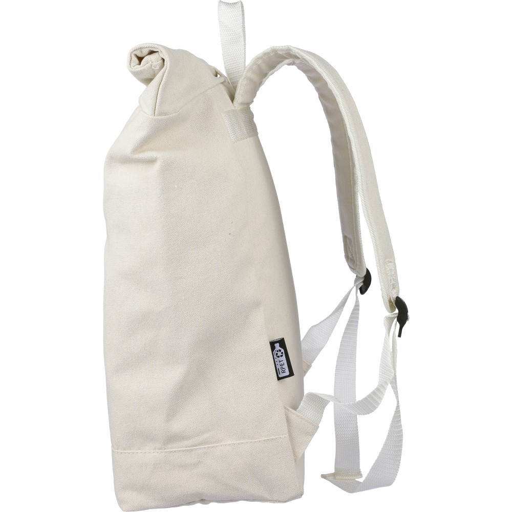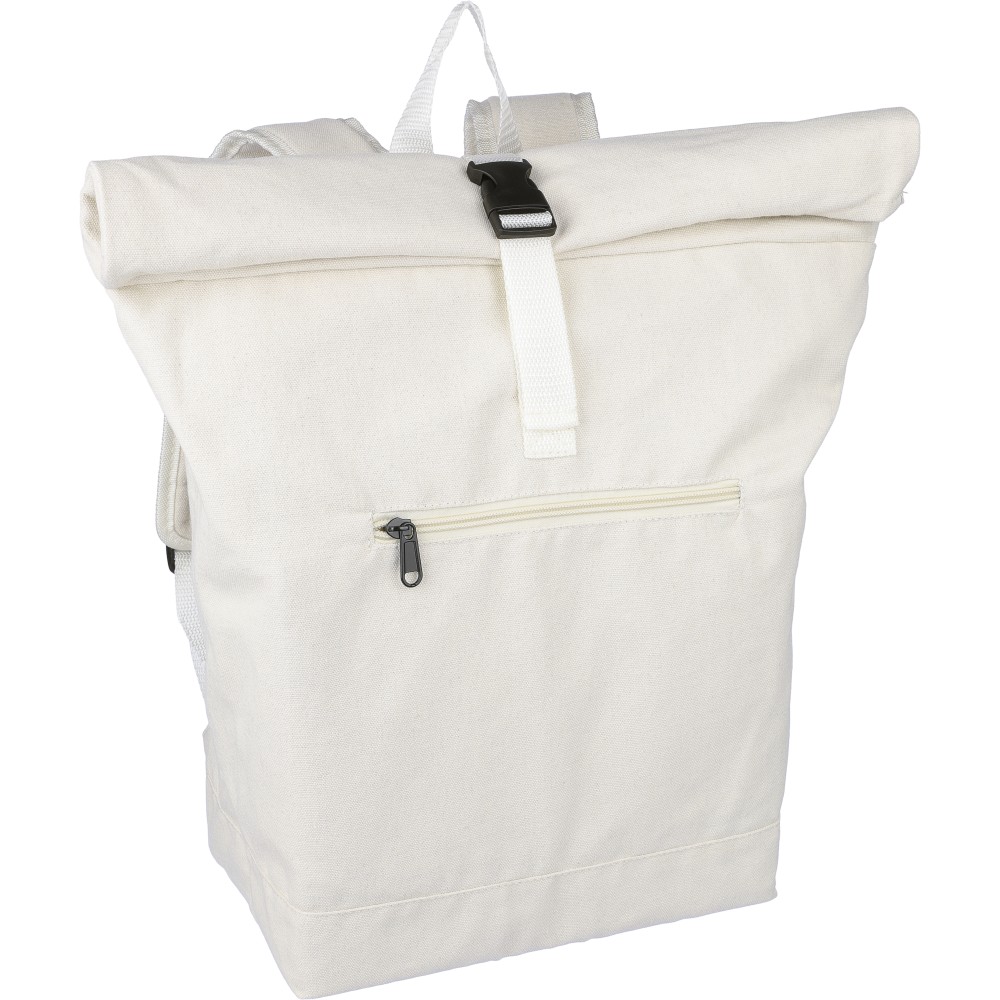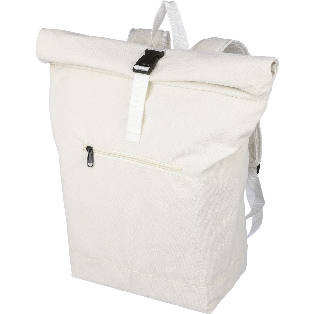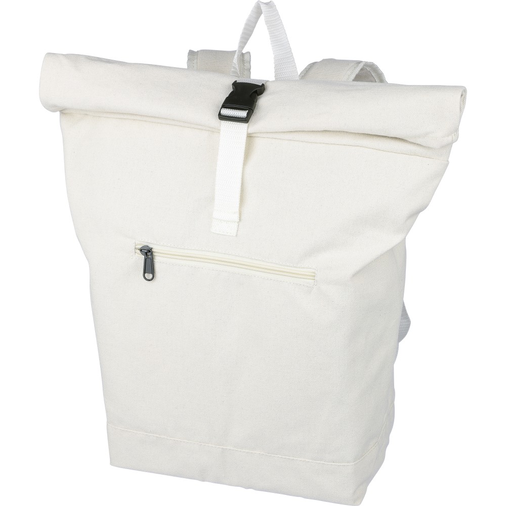 Rolltop hátizsák 330 g/m2 újahasznosított policotton anyagból, 210D poliészter béléssel és műanyag csattal. 15 literes űrtartalommal, egy nagy cipzáras rekesszel, 15"-es laptoptartó résszel, két belső és egy külső rekesszel. Tetején hordozófüllel, párnázott, állítható vállpánttal és egy kicsi, cipzáras elsőzsebbel. Teherbíró képessége 14 kg. Címkét tartalmaz. Emblémázás: Hímzés, Szitanyomás