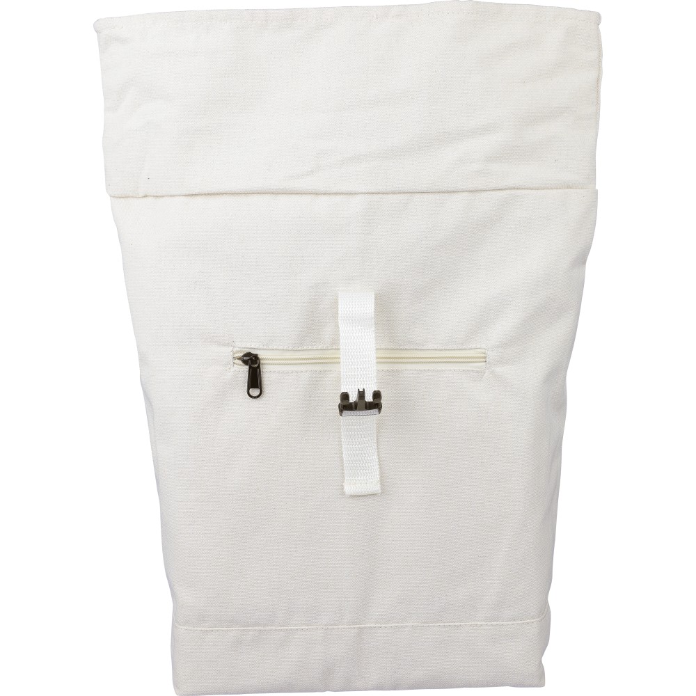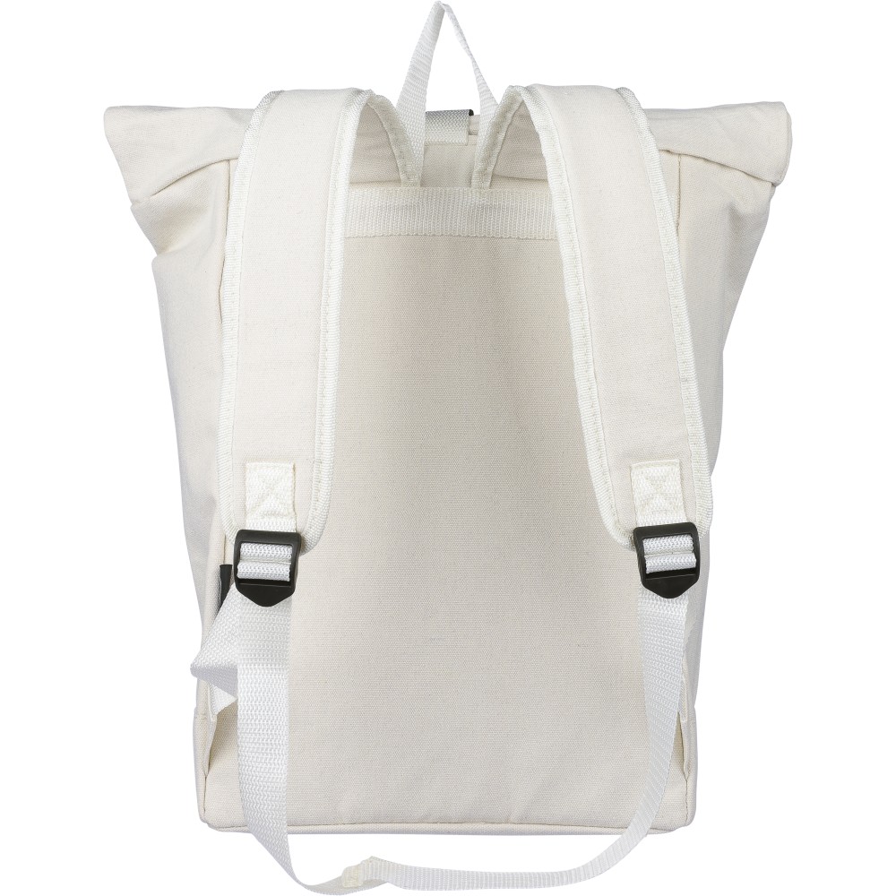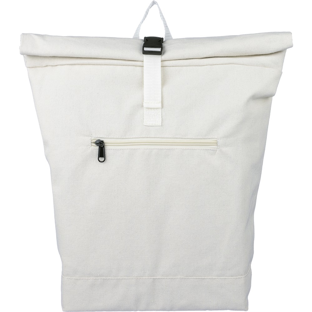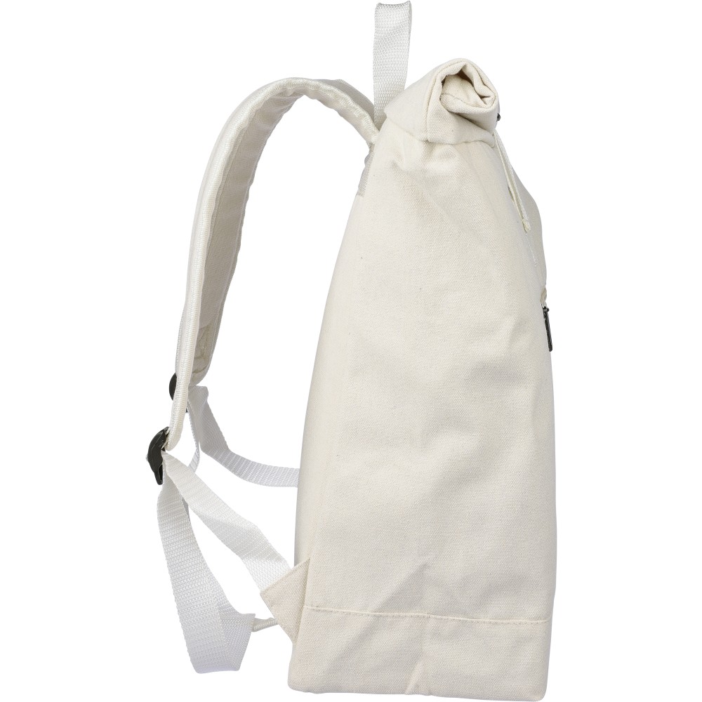 Rolltop hátizsák 330 g/m2 újahasznosított policotton anyagból, 210D poliészter béléssel és műanyag csattal. 15 literes űrtartalommal, egy nagy cipzáras rekesszel, 15"-es laptoptartó résszel, két belső és egy külső rekesszel. Tetején hordozófüllel, párnázott, állítható vállpánttal és egy kicsi, cipzáras elsőzsebbel. Teherbíró képessége 14 kg. Címkét tartalmaz. Emblémázás: Hímzés, Szitanyomás