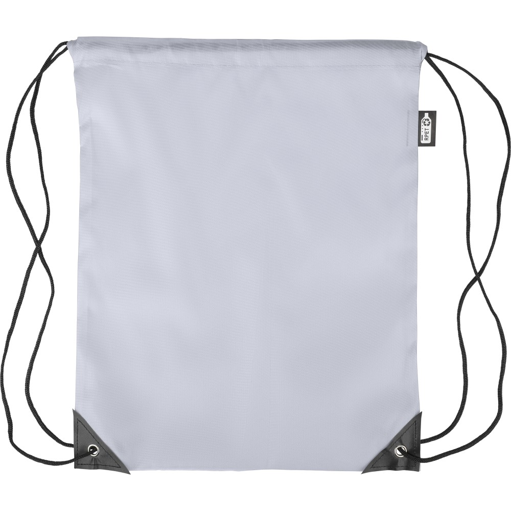 Tornazsák 210D poliészter anyagból, fekete PU sarokerősítéssel az elején, és belső varrással. Fekete nylon húzózsinórral, egy rekesszel. Űrtartalom: 5 liter, teherbíró képesség: 7 kg. rPET címkét tartalmaz. Emblémázás: Szitanyomás