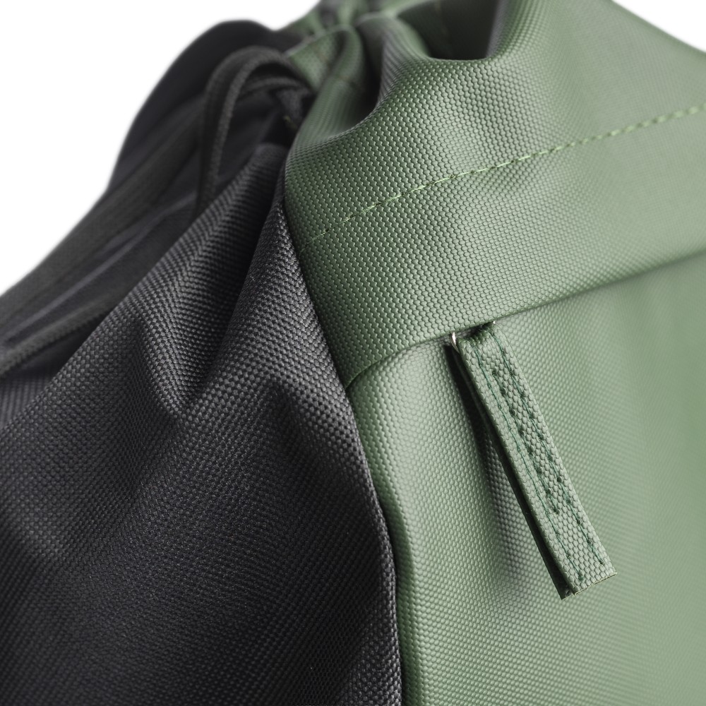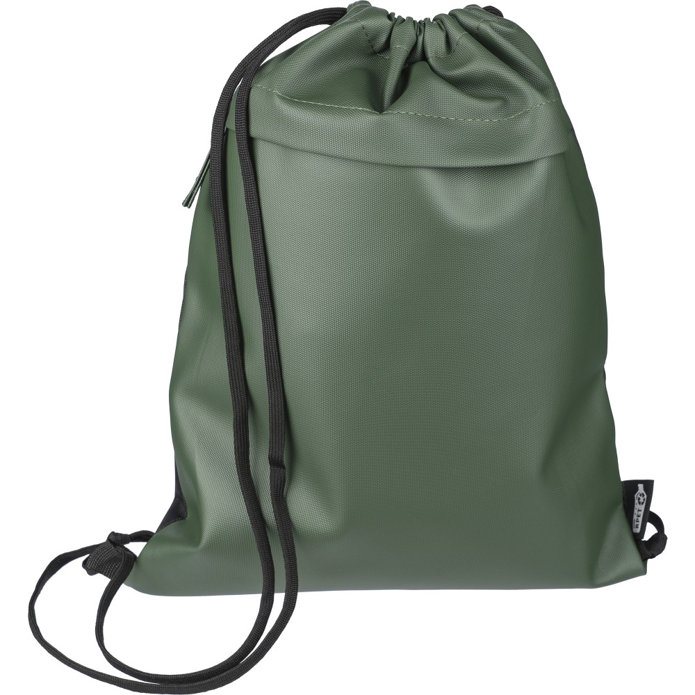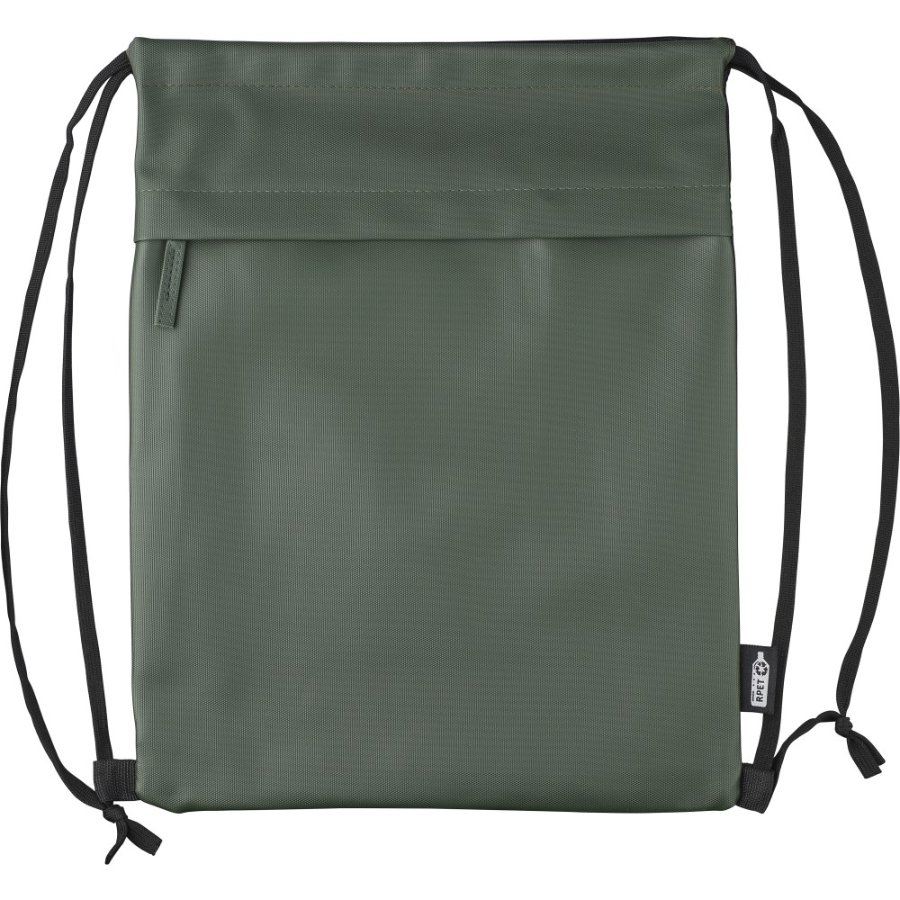 600D rPET poliészter tornazsák. Az elejét PU bevonat teszi vízlepergetővé. Rejtett cipzáras első zsebbel, két tárolórésszel, első és belső zsebekkel. Kapacitása 8 liter, teherbírása 8 kg. Oldalán rPET címkével. Emblémázás: Szitanyomás