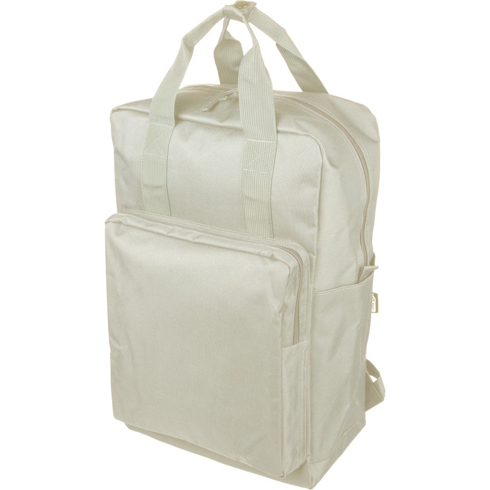 Újrahasznosított 900D poliészterből készült hátizsák, 210D béléssel és rPET címkével. Tágas fő rekesszel rendelkezik, 16?-os laptop számára kialakított külön zsebbel, elülső rekesszel, két oldalzsebbel, valamint bőröndre rögzíthető pánttal (trolley strap). Felső fogantyúi gombbal összefoghatóak, vállpántjai szellőző kialakításúak a kényelmes viselet érdekében. Emblémázás: Szitanyomás