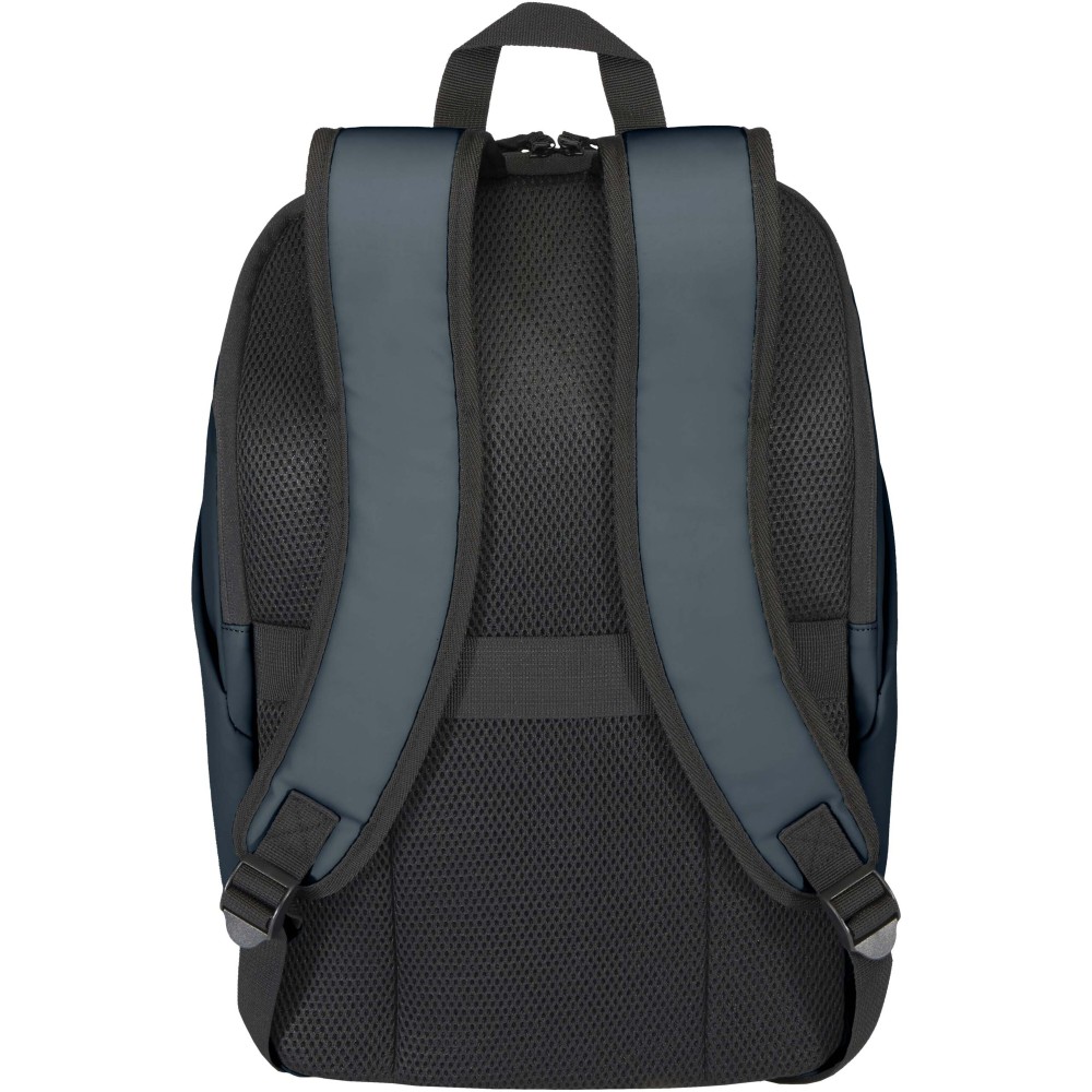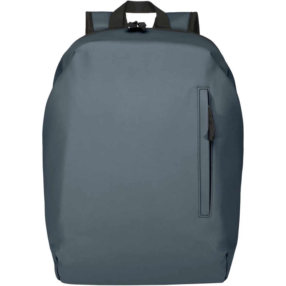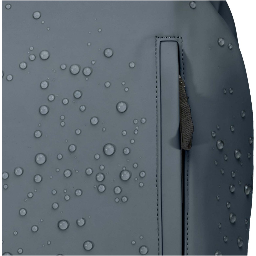 A prémium minőségű, GRS tanúsítvánnyal rendelkező újrahasznosított PU bőrből készült, színben passzoló RPET béléssel ellátott 15?-os biztonsági hátizsák garantálja az értékek védelmét és szárazon tartását útközben. A termék hátulról hozzáférhető laptoprekeszel, két letisztult oldalsó zsebbel, valamint egy vízálló cipzárral felszerelt elülső zsebbel rendelkezik. A légáteresztő hátlap biztosítja az egész napos kényelmet, így ideális választás ingázáshoz, utazáshoz vagy városi használatra. Űrtartalma: 18 liter. Emblémázás: Szitanyomás