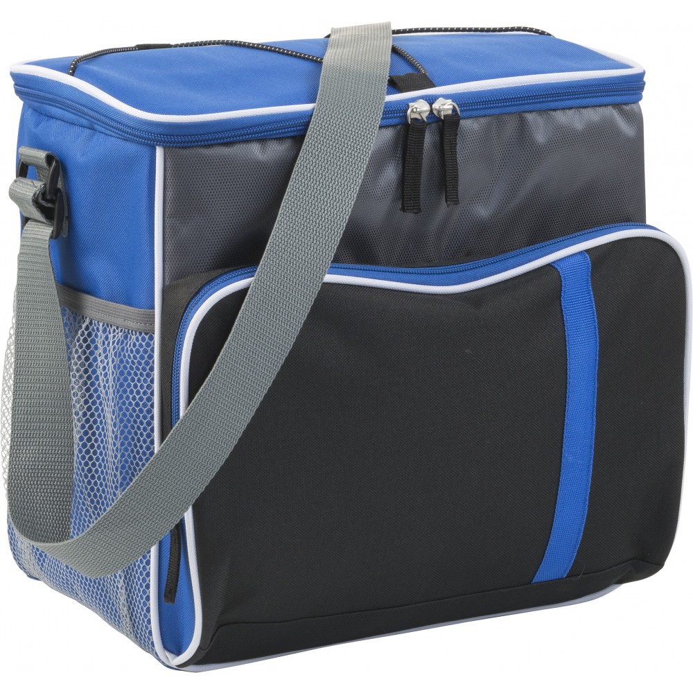 600D poliészter hűtőtáska cipzáros első zsebbel, egy nagy cipzáros résszel, hálós oldalzsebekkel és a tetején elasztikus összefogópánttal. Emblémázás: Szitanyomás