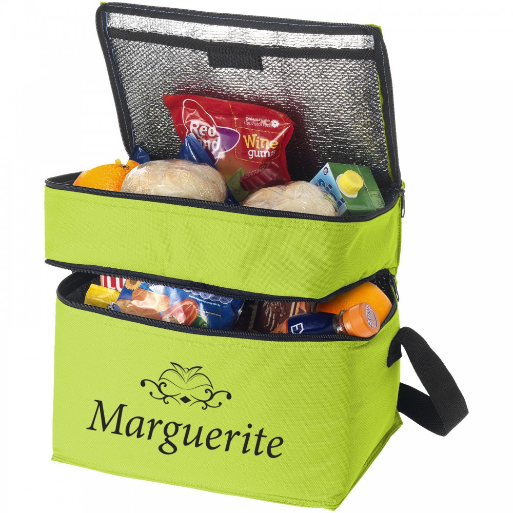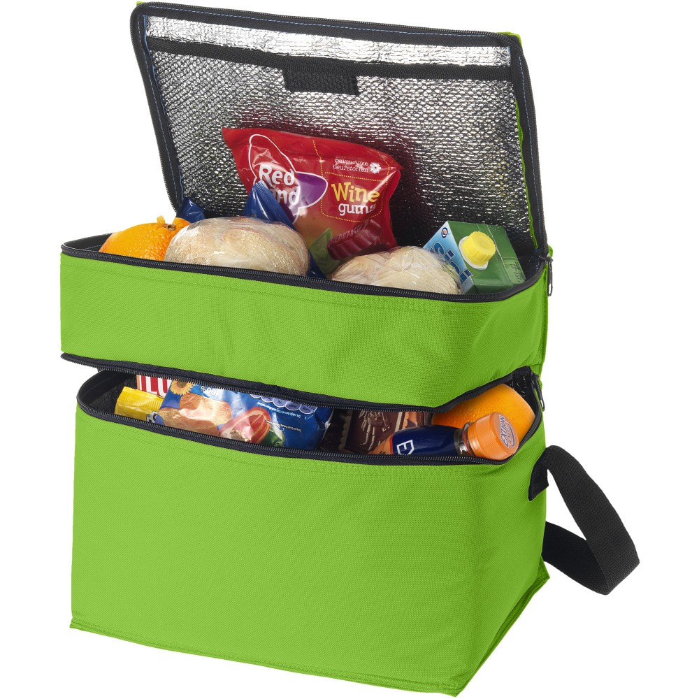 Az Oslo hűtőtáskával bármikor és bárhol hűtött italokat és harapnivalókat biztosíthat. A hűtőtáska két különálló cipzáras rekesszel rendelkezik. A felső része tökéletes az apró falatok tárolására, az alsó része pedig a nagyobb élelmiszerek tárolására. A vállpánt állítható, így a táskát mindenki könnyen hordozhatja. A hűtőtáska 600D poliészterből készült, amely egy nagy teherbírású és tartós szövet. Emblémázás: Szitanyomás