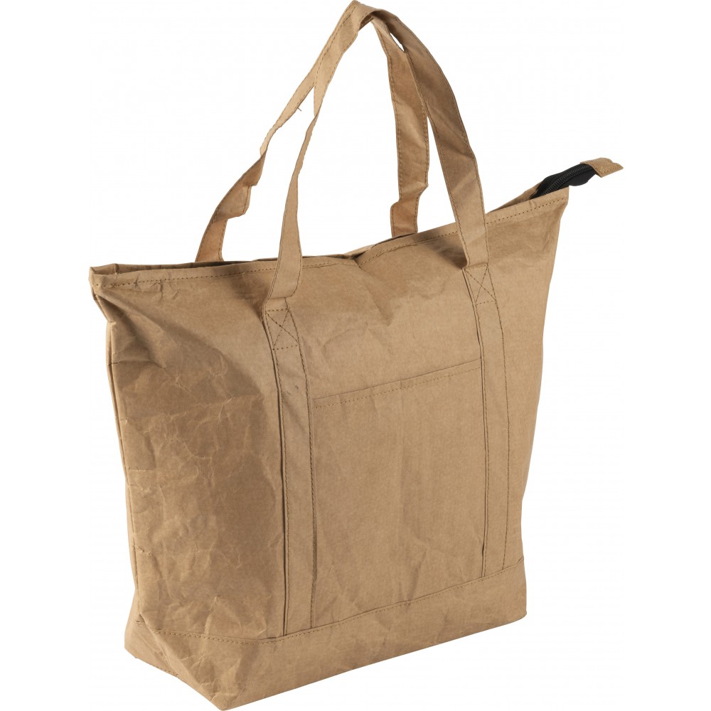 Laminált papír hűtőtáska és bevásárlótáska ezüst színű fóliabéléssel. Cipzáros fő rész oldalzsebbel. A zseb mérete: 16, 8 x 15, 6 cm. PE, alumínium fólia, 80 g papír. Emblémázás: Szitanyomás