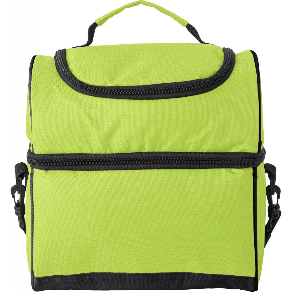 Hűtőtáska, PEVA béléssel, a fedélben külön nyitható résszel, állítható pánttal. 600D poliészter. Emblémázás: Szitanyomás