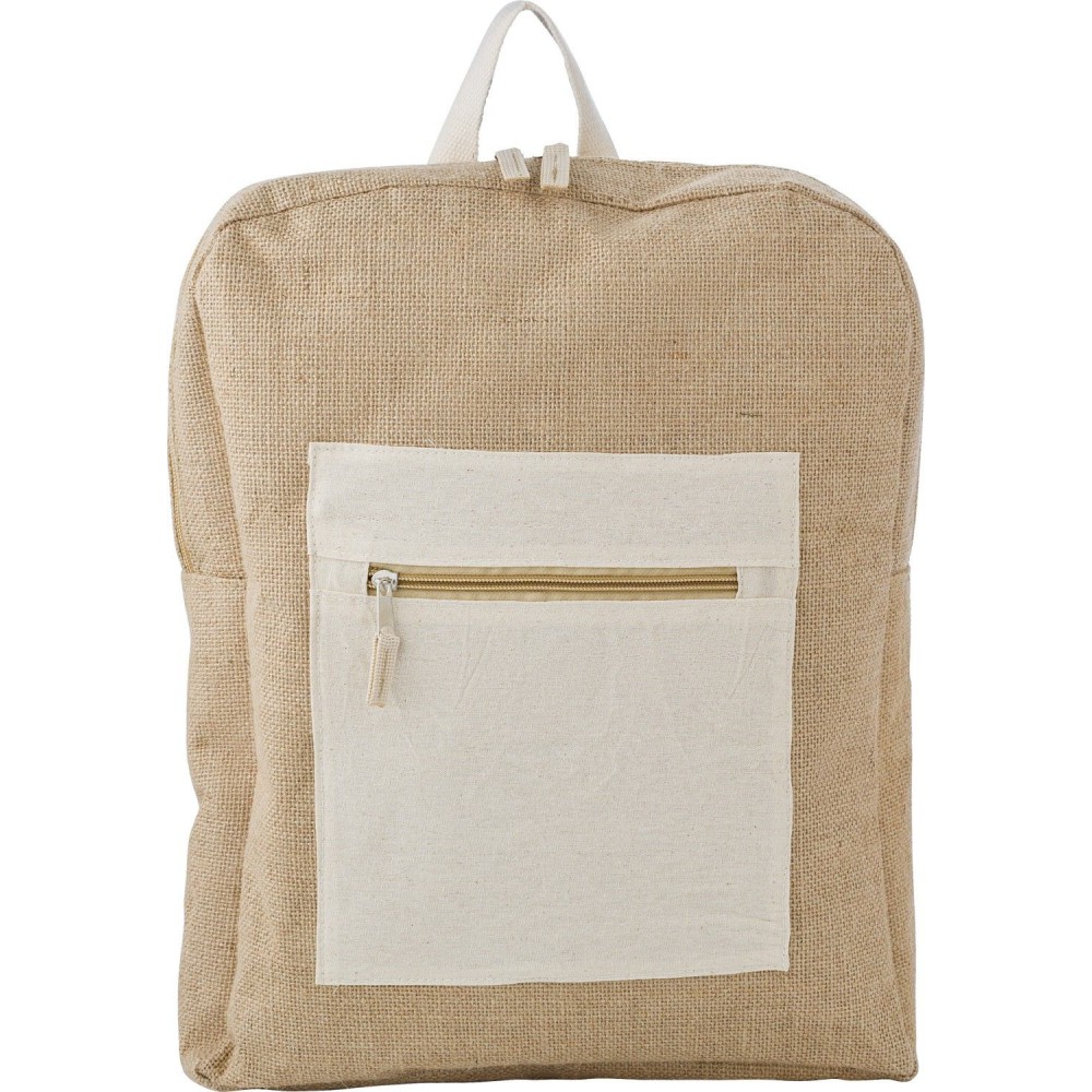 Hátizsák egy cipzáras fő rekesszel, első zsebbel, állítható vállpántokkal. Juta anyag pamut kiegészítőkkel. Emblémázás: Szitanyomás