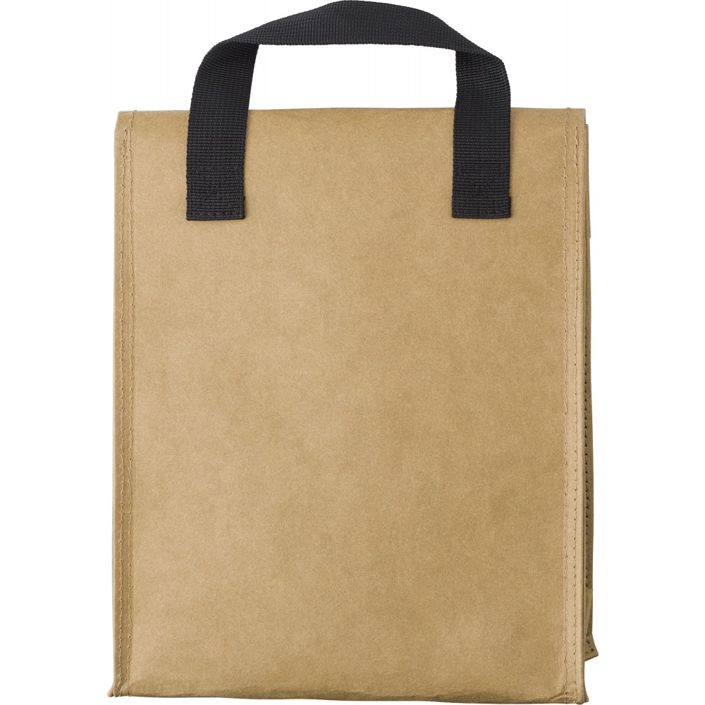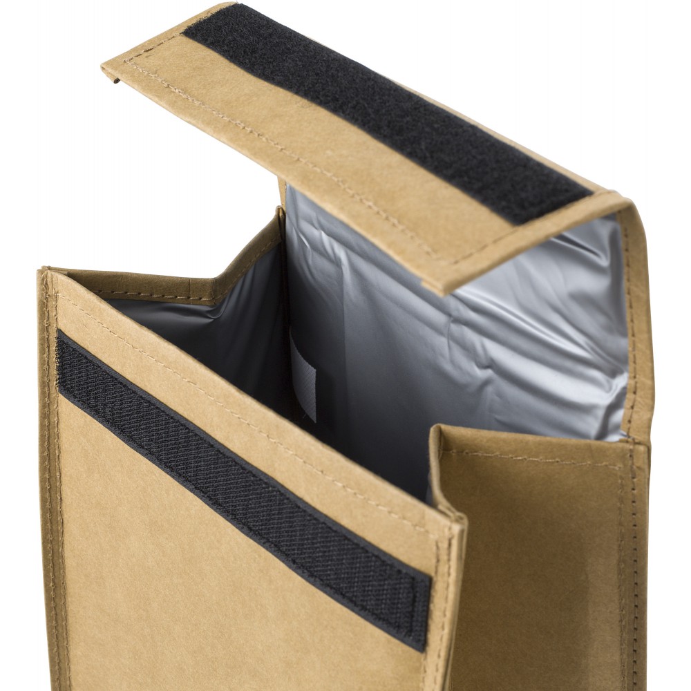 Mosható kraftpapír hűtőtáska PEVA (15C) béléssel. Egy rövid fogantyúval és tépőzárral. Emblémázás: Szitanyomás