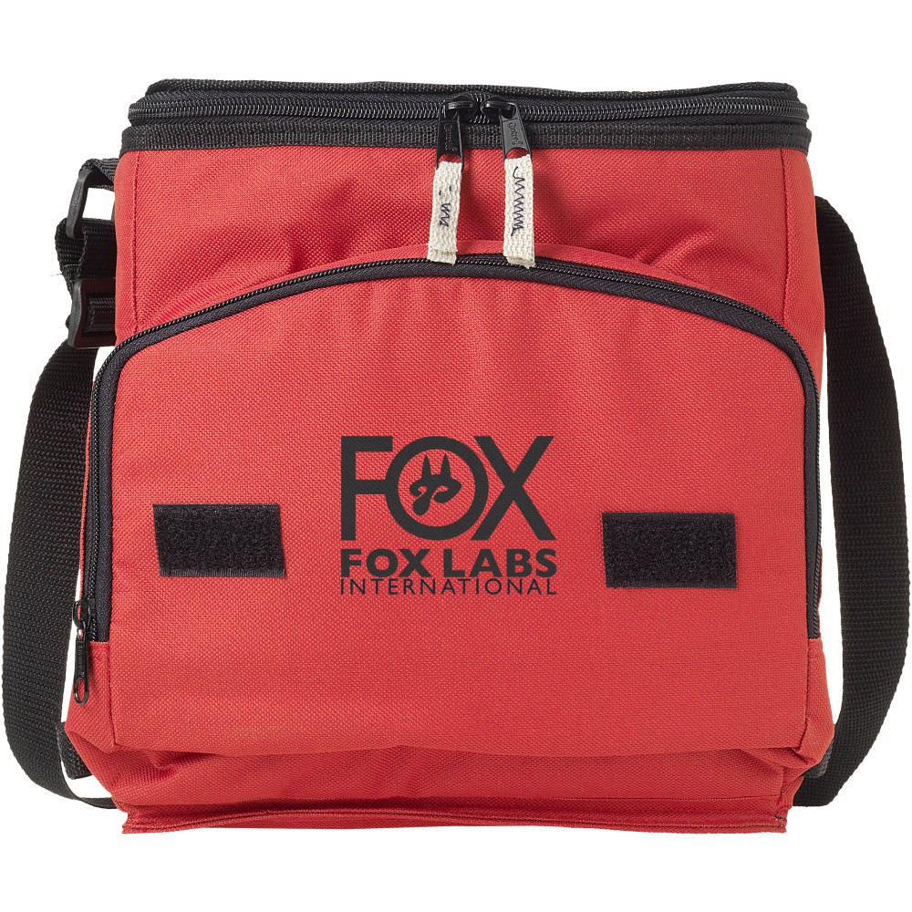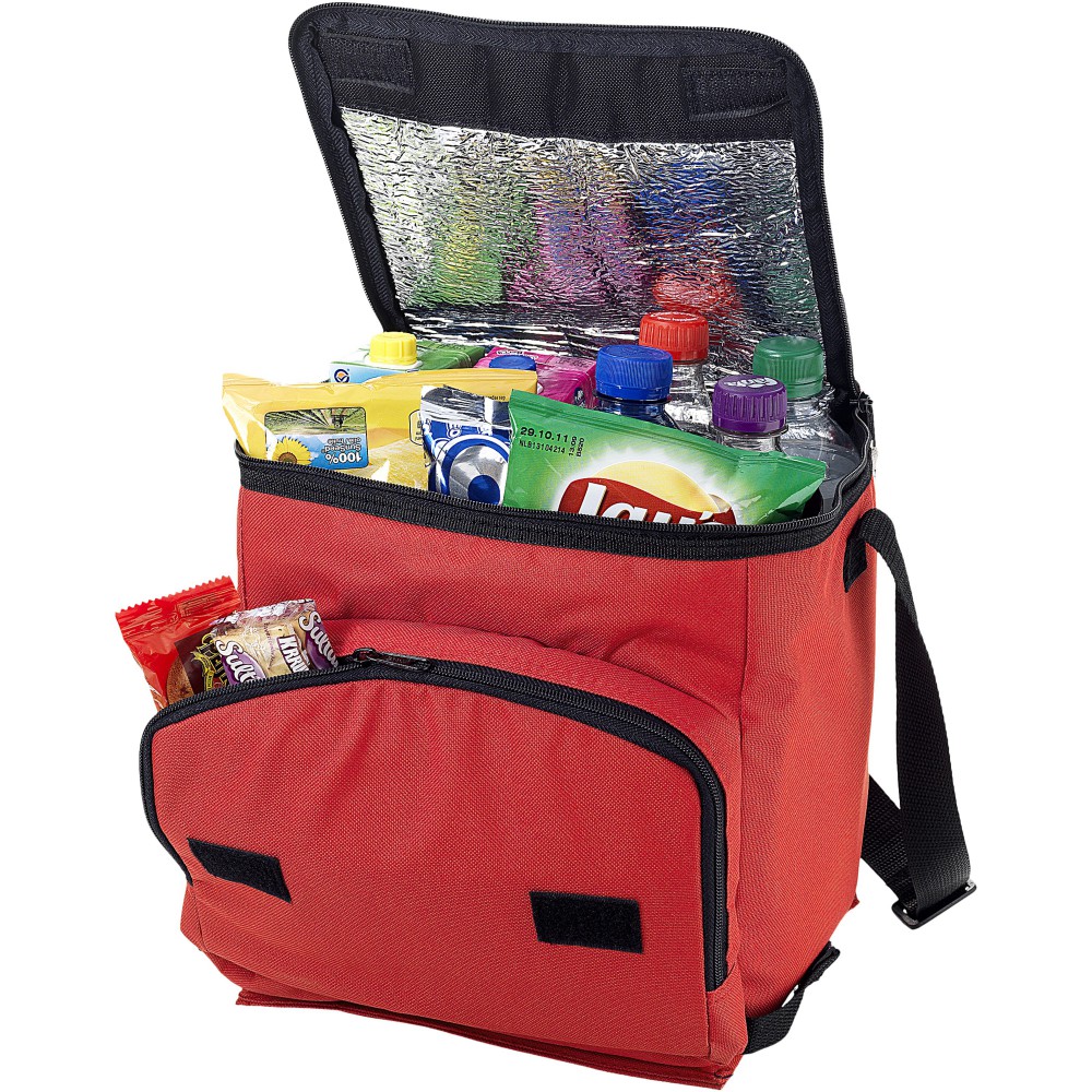 Összehajtható hűtőtáska cipzáras fő rekesszel és cipzáras elülső zsebbel. Állítható vállpánt. A hűtőtáska laposra hajtható az elülső zseben található horog és hurok segítségével. Egyéb kiegészítőt nem tartalmaz. Emblémázás: Szitanyomás