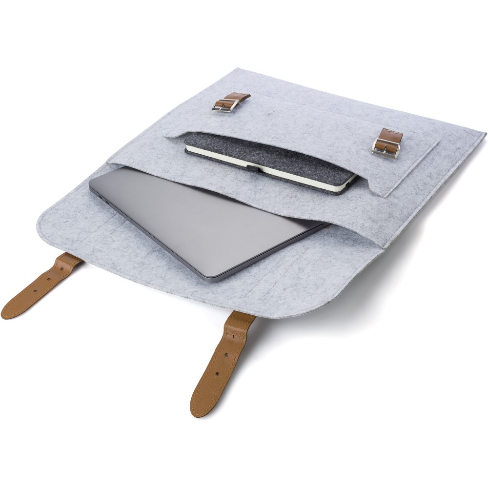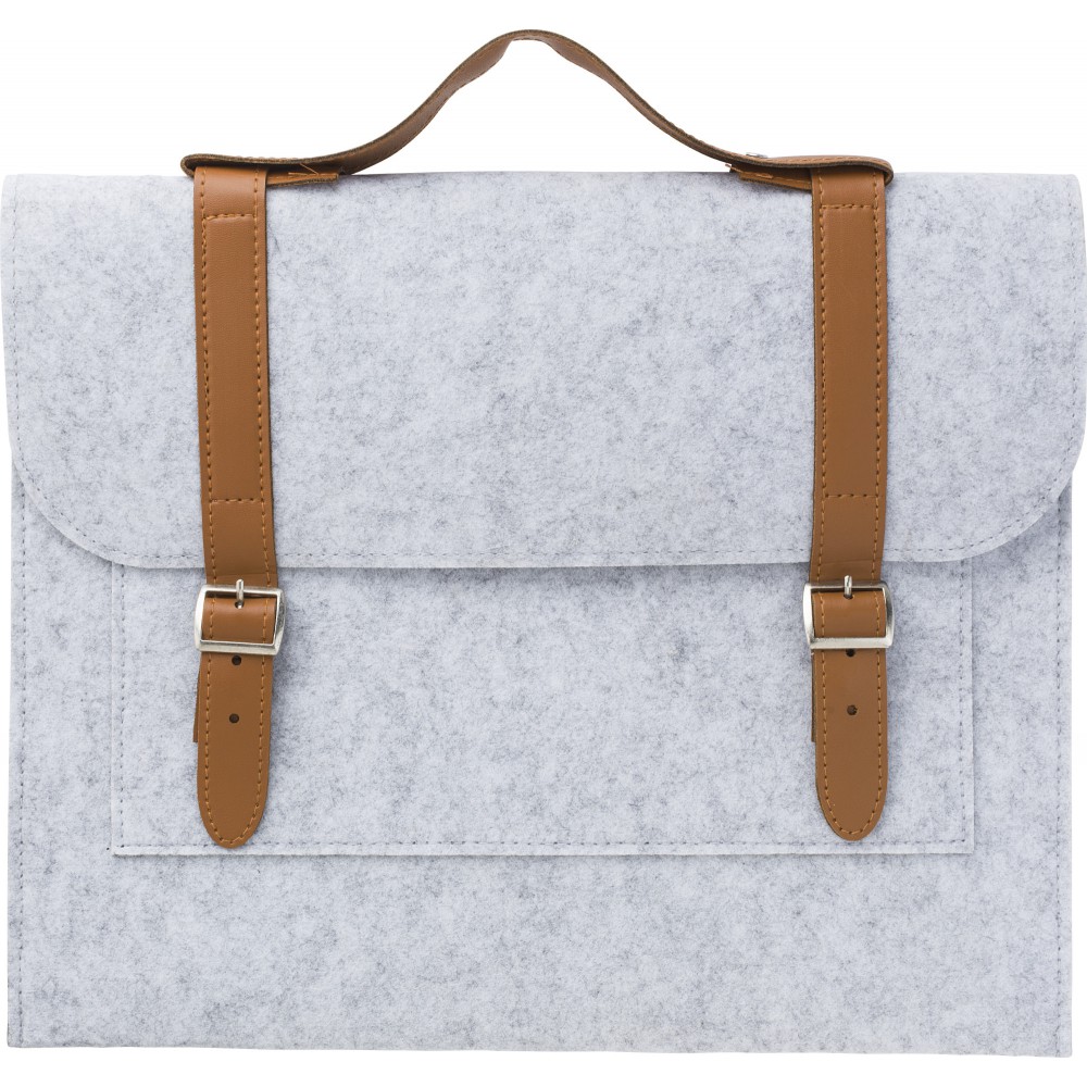 RPET filcből készült irattáska PU részletekkel. Egy nagy rekesz. A táska két csattal záródik. Emblémázás: Hímzés, Szitanyomás
