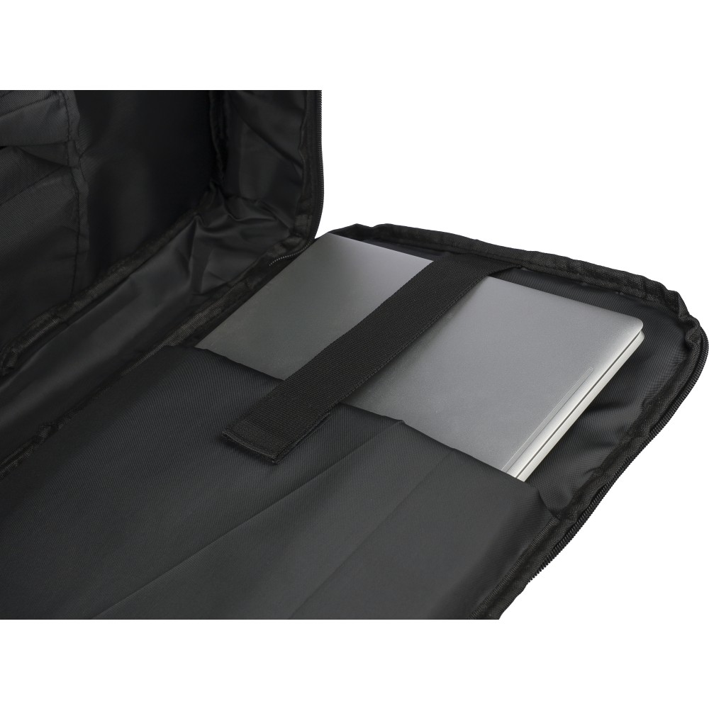 Laptophátizsák 300D rPET poliészter anyagból, 210D rPET béléssel. Egy nagy cipzáras rekesszel, számtalan belső zsebbel, tépőzáras laptoptartó zsebbel 15"-es laptop számára és 12 literes űrtartalommal. Megerősített, szellőző hátrésszel, állítható vállpánttal, oldalsó hordozófüllel és gurulóstáskára való felhelyezésre alkalmas pánttal. Teherbíró képesség: 10 kg. Emblémázás: Szitanyomás
