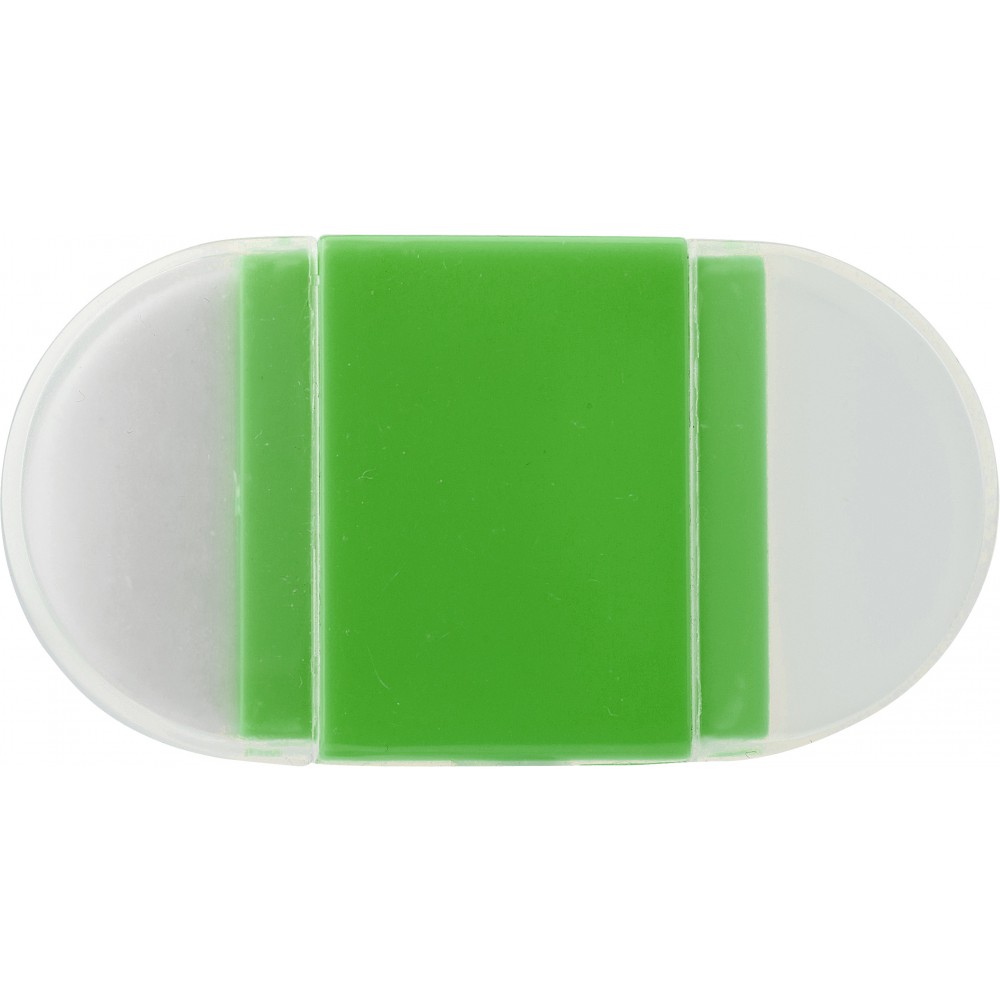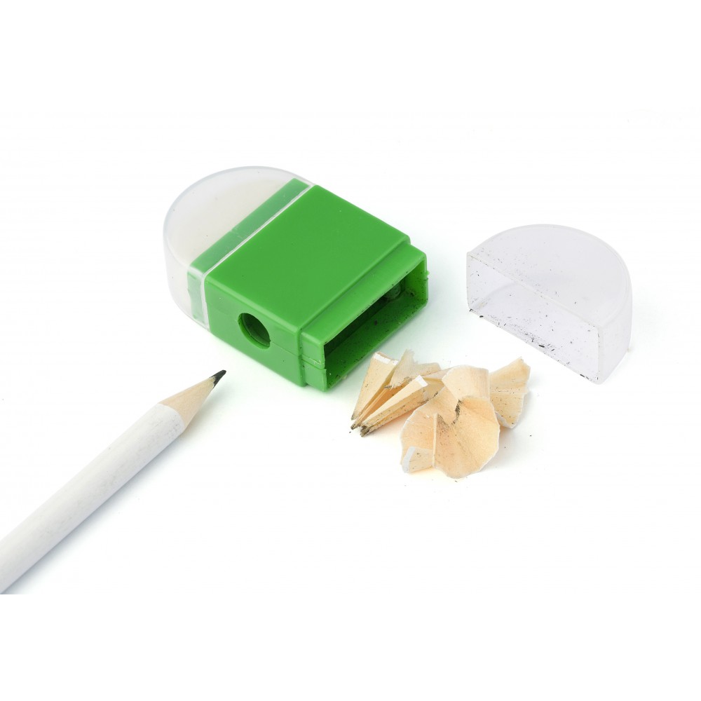 Radír ceruzahegyezővel, mindkét oldalon kupakkal. Emblémázás: Tamponnyomás, UV nyomtatás