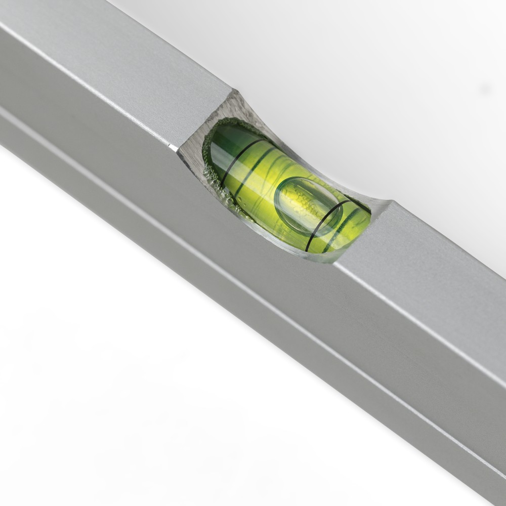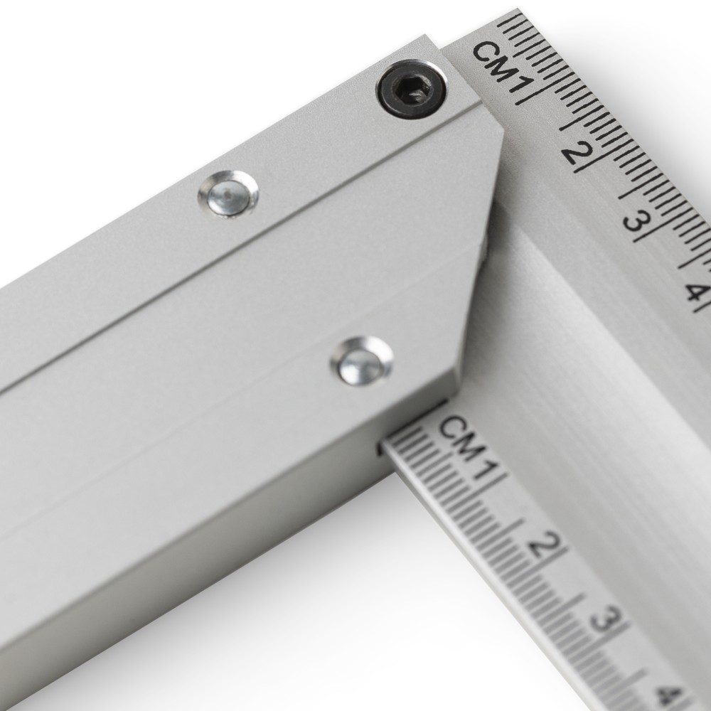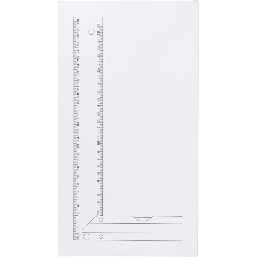 Alumíniumból készült derékszögmérő szintezővel, 30 cm hosszúsággal, centiméter beosztással. Praktikus kialakítás a pontos méréshez és szintezéshez. Darabonként illusztrációval ellátott barna kartondobozba csomagolva. Emblémázás: Gravírozás