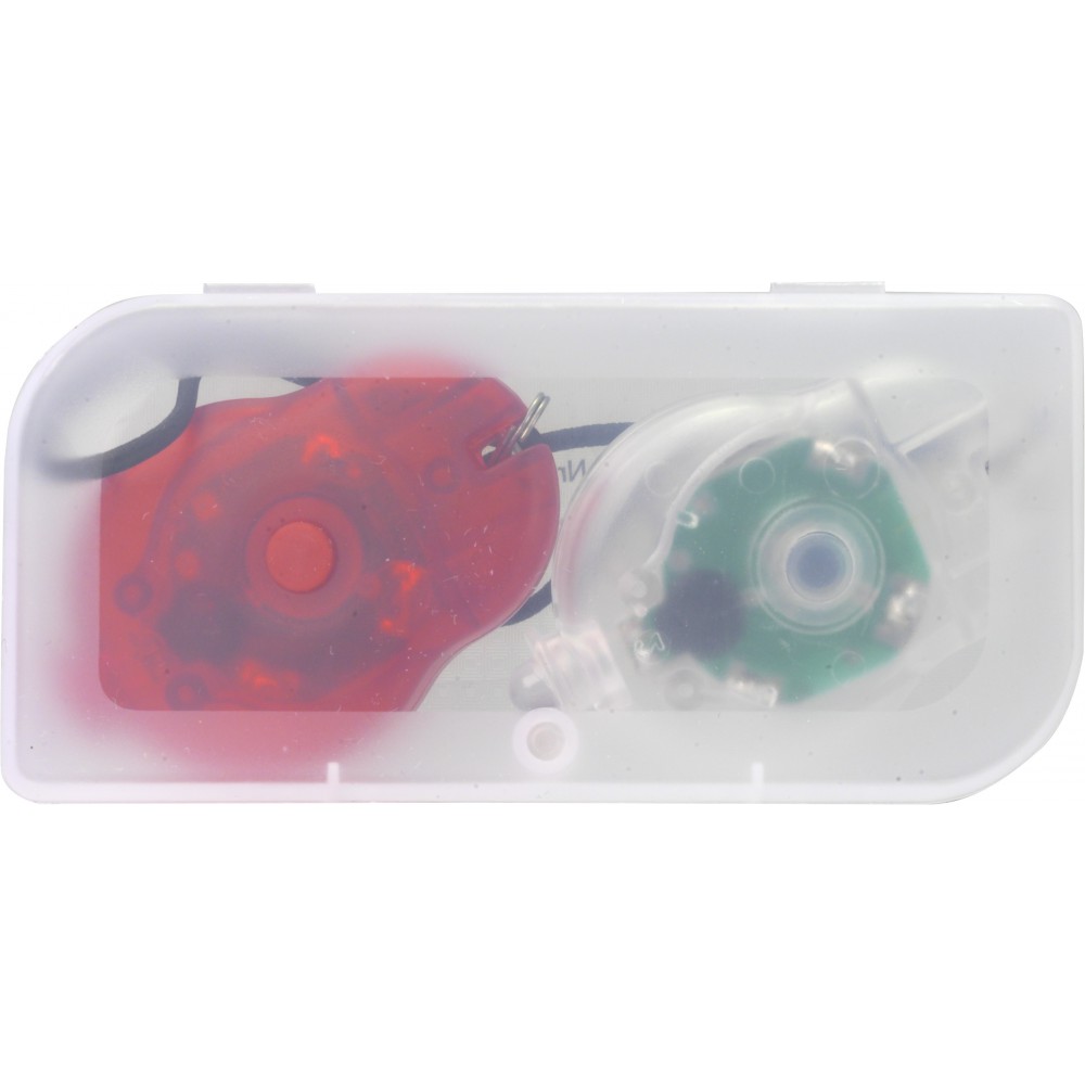 Biciklislámpa szett. 2 db mini biciklislámpa 1-1 LED fénnyel, átlátszó dobozban. Emblémázás: Tamponnyomás, UV nyomtatás
