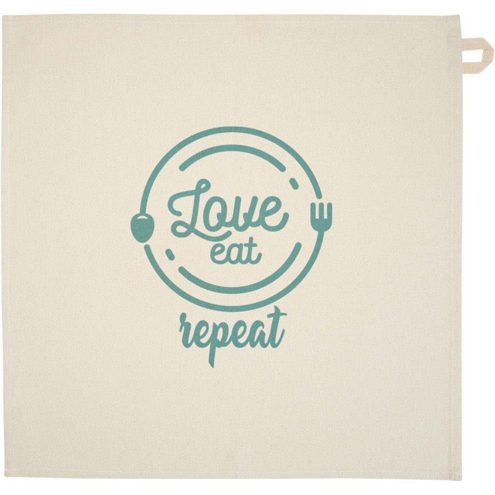 Konyharuha 100% GRS tanúsítvánnyal, 200 g/m2 újrahasznosított pamutból készült, és jellegzetes kontrasztos akasztóval rendelkezik. Mérete: 50 x 50 cm. Emblémázás: Hímzés, Szitanyomás