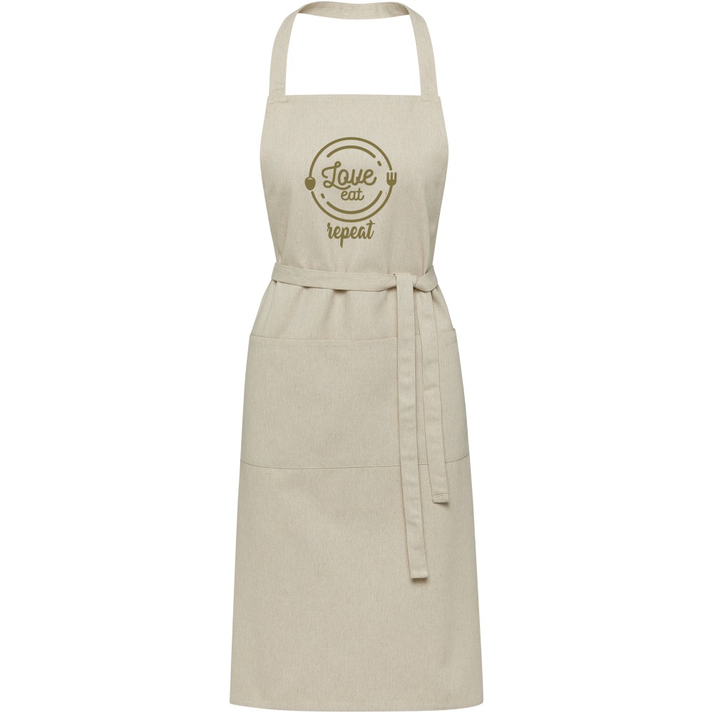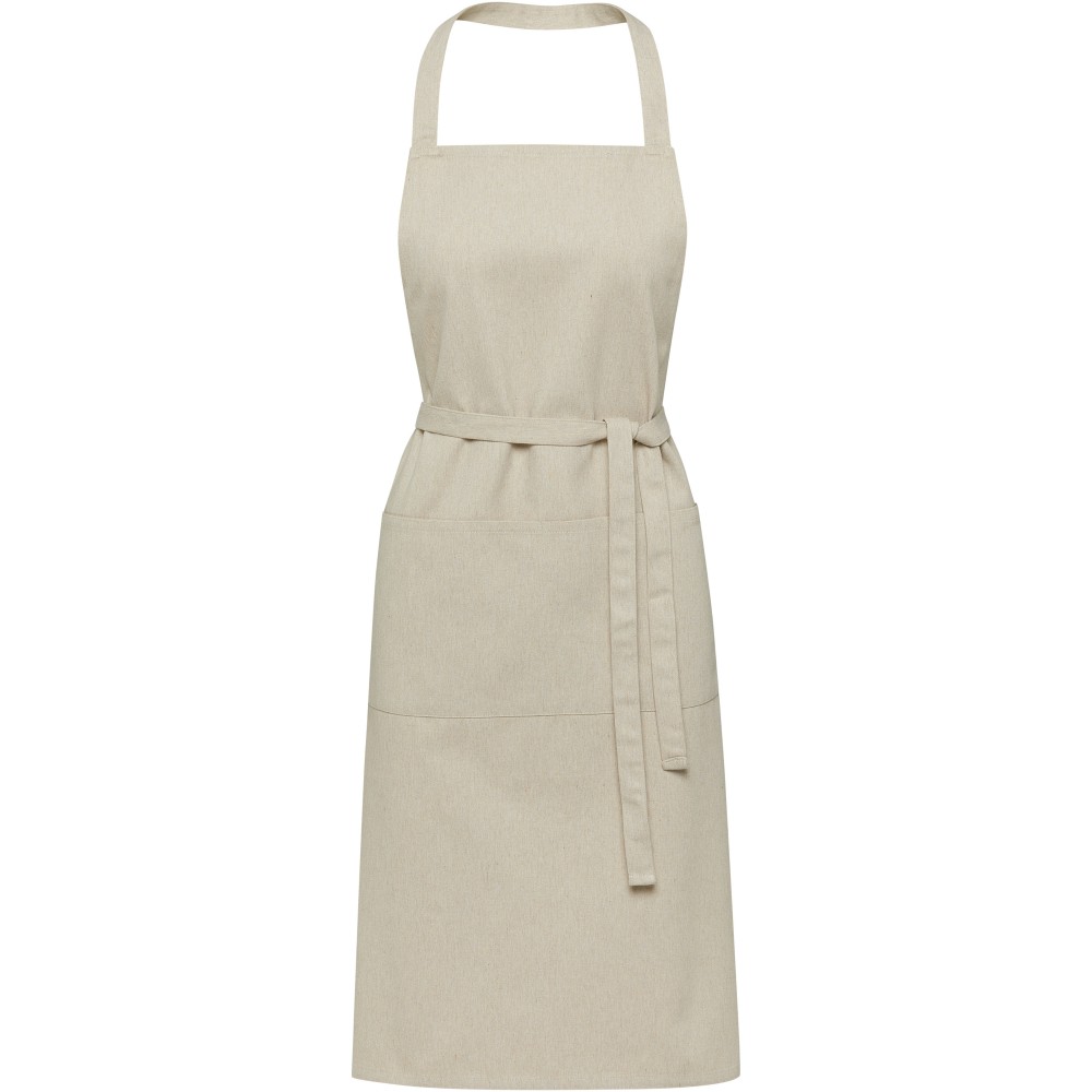 A Shara kötény 70% újrahasznosított pamutból és 30% újrahasznosított poliészterből készült, így vastag, strapabíró és kényelmes viselet. A kötény 2 egymás melletti zsebbel (egyenként 22 x 20 cm) és egy 1 méteres megkötővel rendelkezik. A kötény Cyclo újrahasznosított szálakat tartalmaz, ahol előválogatott hulladékot használnak, amely meghatározza a fonal színét. Minden kötényhez egy Aware nyomjelző is tartozik. Ez az innovatív funkció lehetővé teszi a felhasználók számára, hogy egy QR-kód segítségével nyomon követhessék a termék eredetét és útját, növelve az ellátási lánc átláthatóságát és elősegítve a termék és a gyártási folyamat közötti szorosabb kapcsolatot. Emblémázás: Hímzés, Szitanyomás