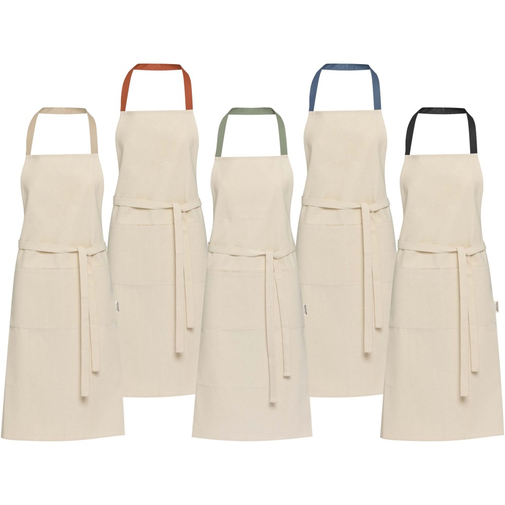 A Nia kötény 100% GRS tanúsítvánnyal rendelkező, 200 g/m2 újrahasznosított pamutból készült. Természetes pamut színe és kontrasztos nyakkpántja elegánsan védi ruhádat főzés közben. Két egymás melletti zsebbel rendelkezik, összesen 45 x 20 cm-es mérettel, és 1 méter hosszú pánttal rögzíthető hátul. Emblémázás: Hímzés, Szitanyomás