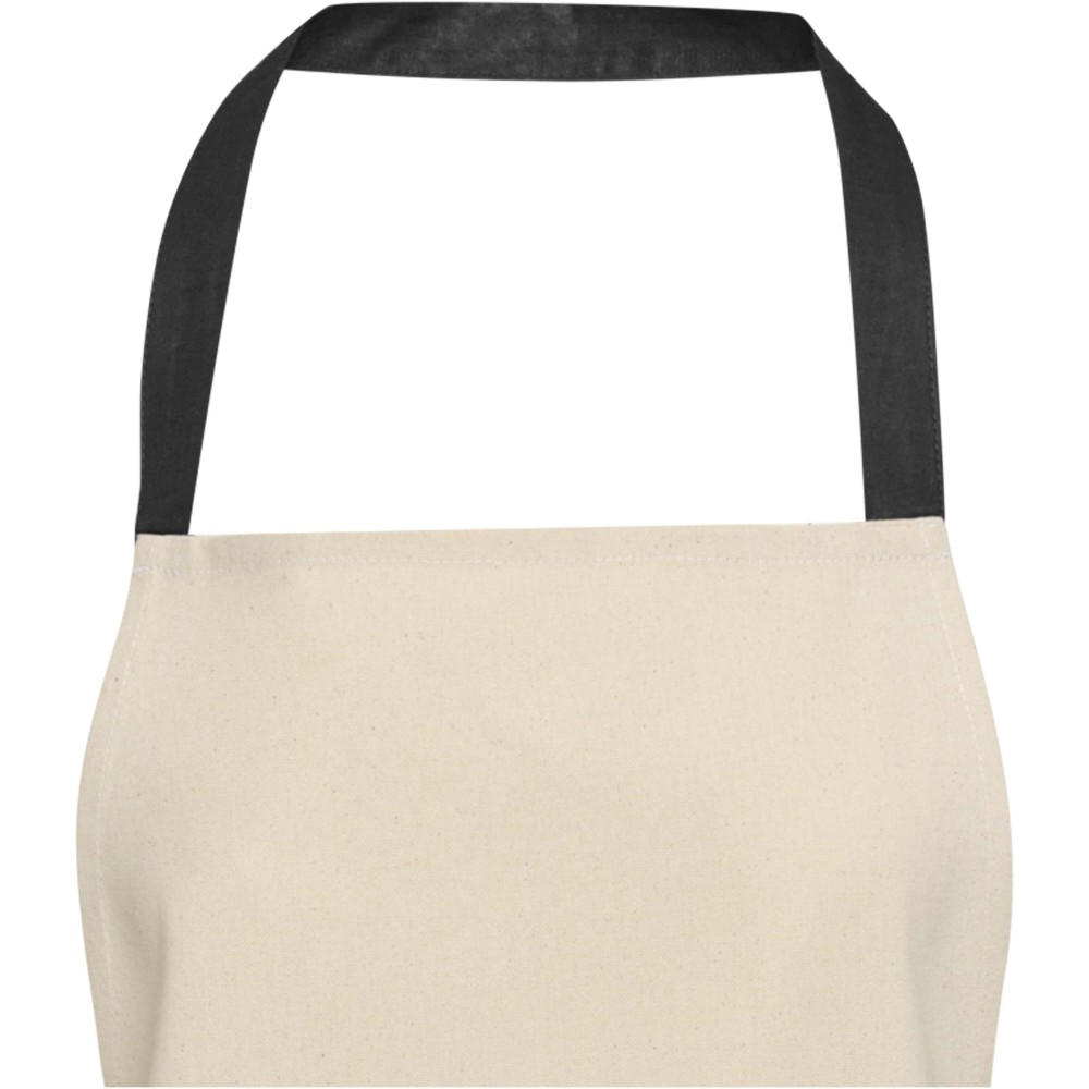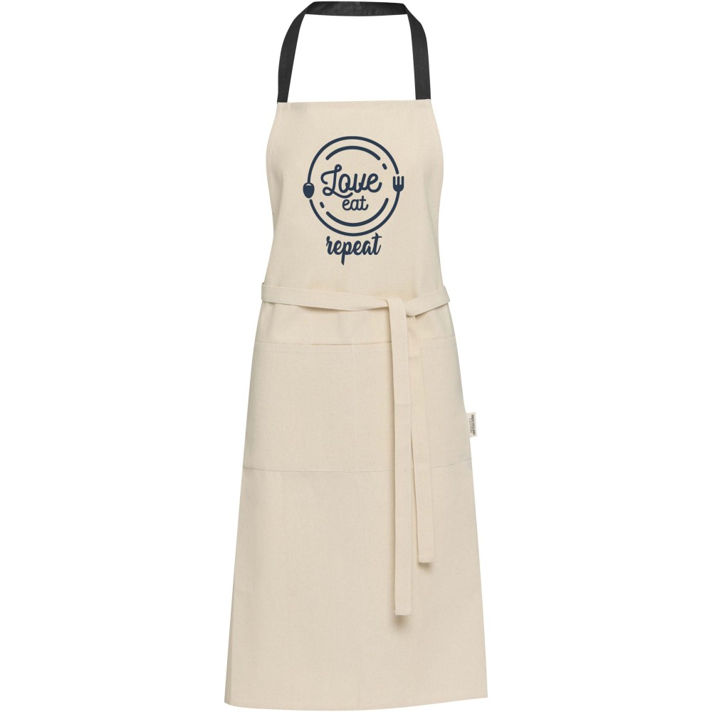 A Nia kötény 100% GRS tanúsítvánnyal rendelkező, 200 g/m2 újrahasznosított pamutból készült. Természetes pamut színe és kontrasztos nyakkpántja elegánsan védi ruhádat főzés közben. Két egymás melletti zsebbel rendelkezik, összesen 45 x 20 cm-es mérettel, és 1 méter hosszú pánttal rögzíthető hátul. Emblémázás: Hímzés, Szitanyomás