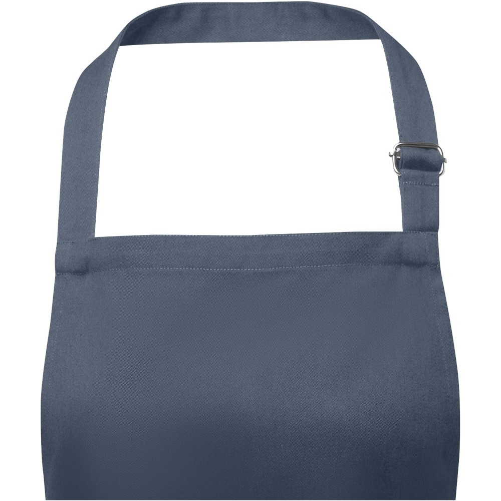 Vastag és masszív anyag, ugyanakkor puha és kényelmes viselet. A két elülső zseb gyors és egyszerű módot kínál a konyhai eszközök tárolására. A kötény nyakában csattal állítható, hátul megköthető. Nagyméretű nyomtatási lehetőség a logók megjelenítéséhez. Pamut twill 65% poliészterből és 35% pamutból, 240 g/m2. Emblémázás: Hímzés, Szitanyomás