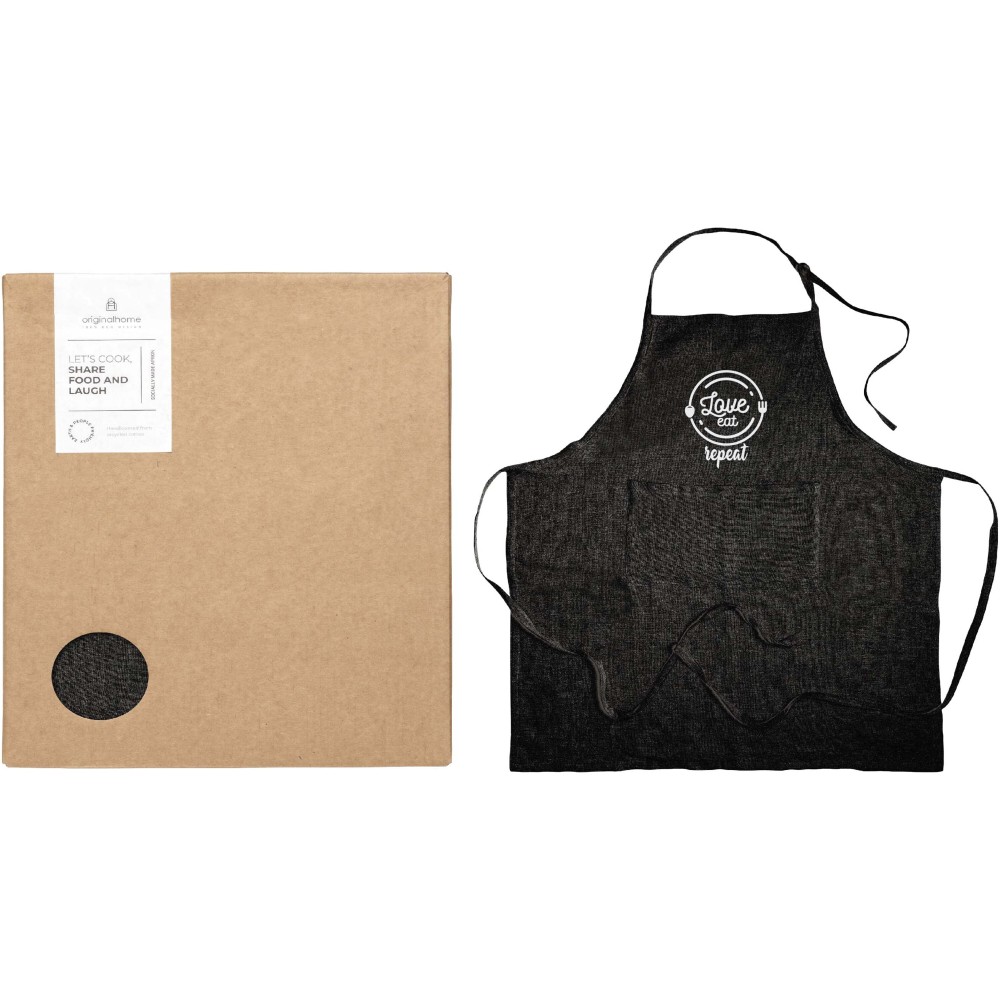 Ez a 100%-ban a bangladesi ruházati iparból származó, újrahasznosított anyagokból készült kötény hagyományos kézi szövőszéken készül, így a termék megvásárlása a helyi női vállalkozók tevékenységét támogatja. A professzionális megjelenésű konyhai kiegészítő ideális társadalmi felelősségvállalást tükröző ajándék, amely egyszerre szolgálja a fenntarthatósági és a szociális célokat. A terméket esztétikus ajándékdobozban szállítjuk. Az anyagösszetétel 70% újrahasznosított pamut, 25% újrahasznosított poliészter és 5% egyéb újrahasznosított rost. Emblémázás: Hímzés, Szitanyomás