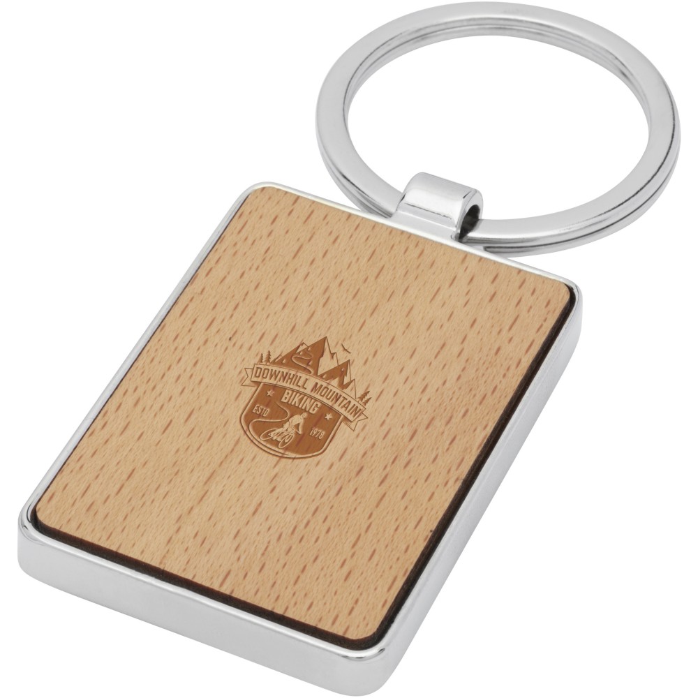 Téglalap alakú kulcstartó bükkfa és cink ötvözet burkolattal, barna tasakban. A felület mérete: 4 x 4 cm. Kiválóan lézergravírozható. 90% bükkfa és 10% Cinkötvözet. Emblémázás: Gravírozás, Tamponnyomás